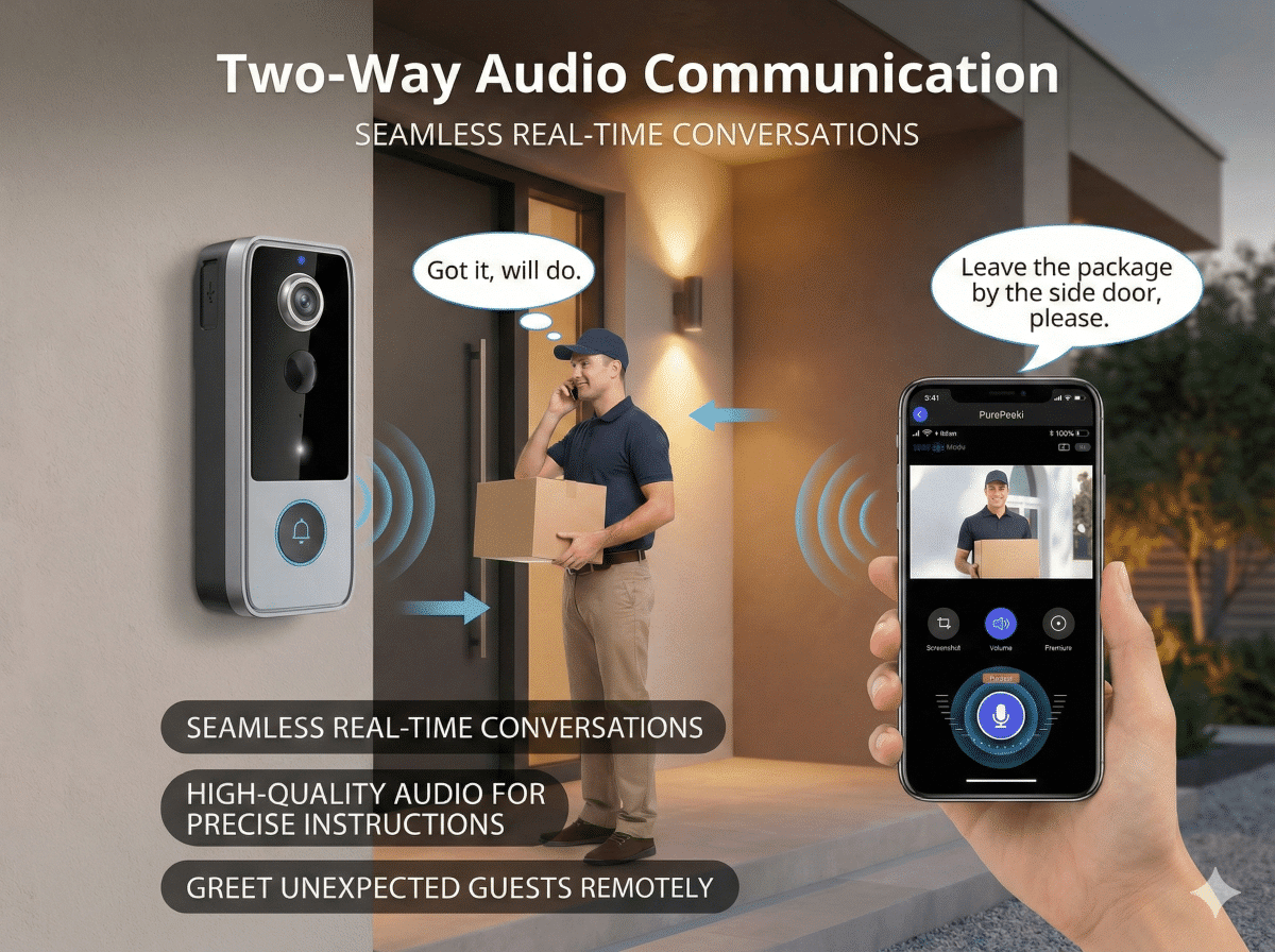 Speak with visitors in real-time from anywhere. Greet guests, instruct delivery drivers, or deter unwanted visitors—crystal-clear communication at your fingertips.