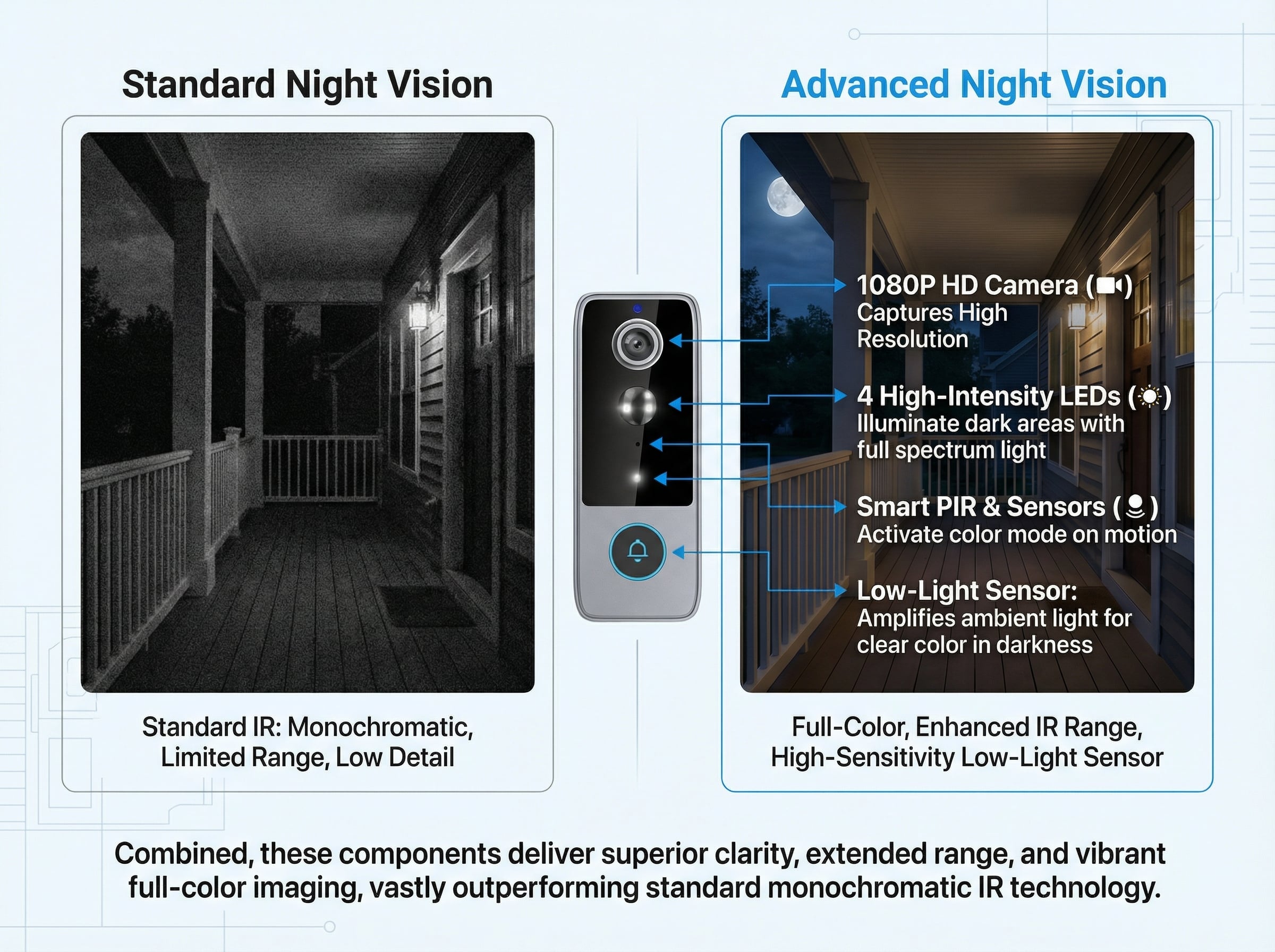 Capture every detail in stunning full HD resolution. Identify visitors clearly, read package labels, monitor your entrance—reliable footage when you need it most.
