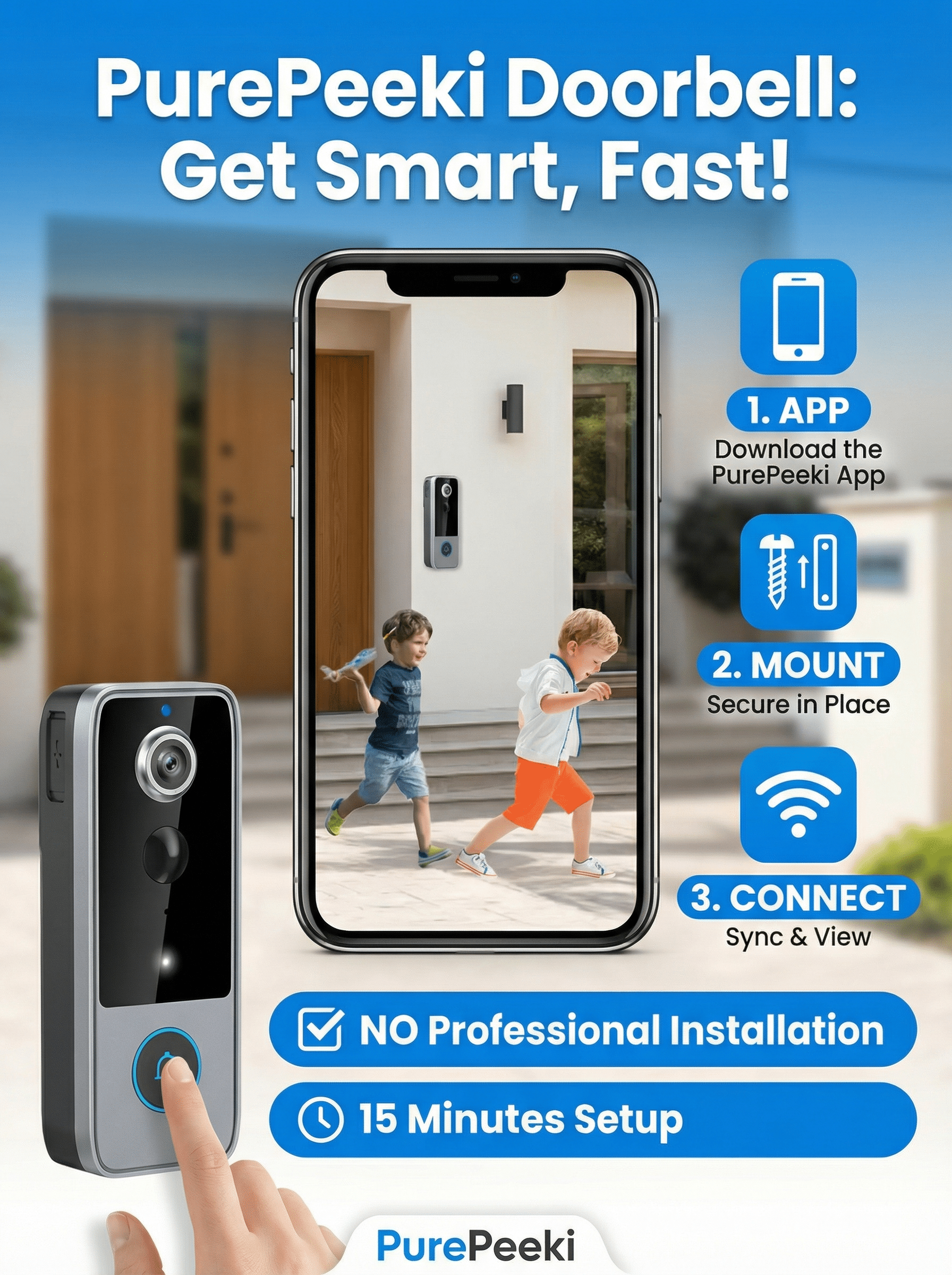 No professional installation needed. No complicated wiring. Just three simple steps to complete home security.