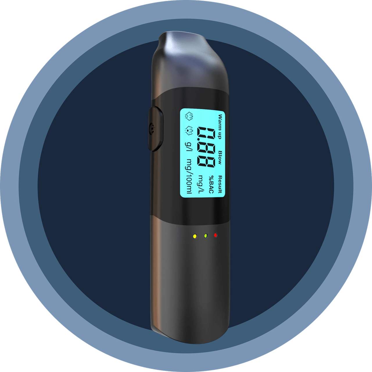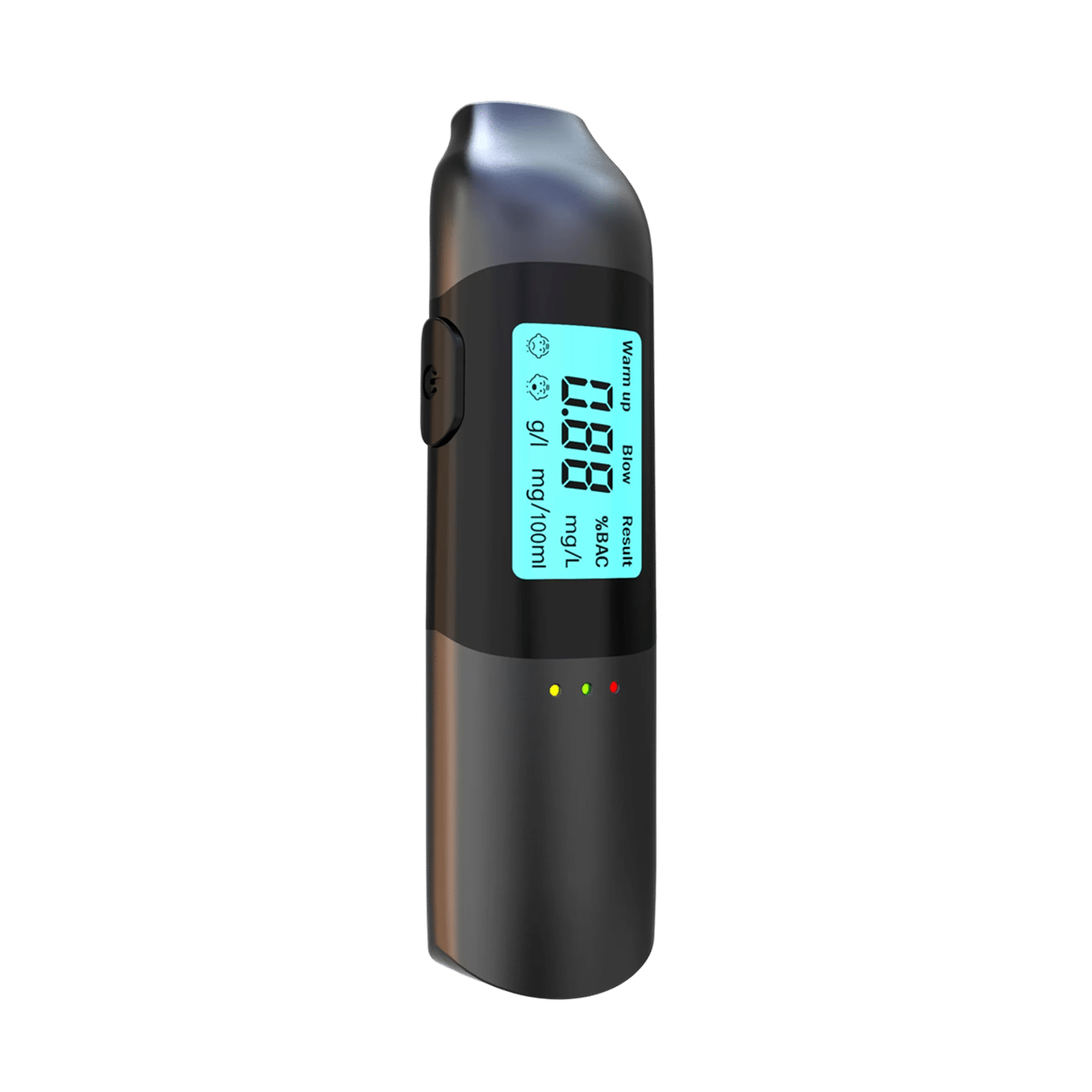 Green indicates safe BAC levels for driving, yellow signals caution and elevated levels, and red warns of dangerous concentrations. The LCD display also shows precise numerical BAC readings.
