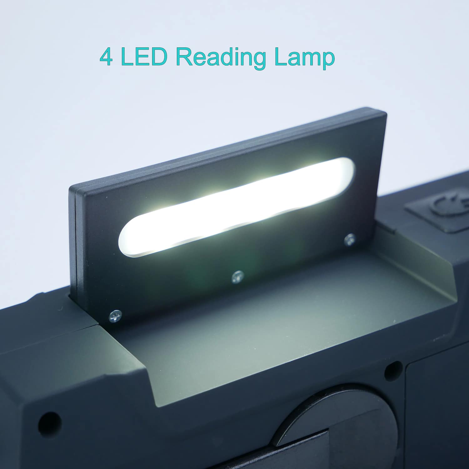 The 1W LED flashlight produces approximately 100 lumens with zoom capability. The 4 LED reading lamp provides sufficient illumination for reading and close-range tasks during power outages.