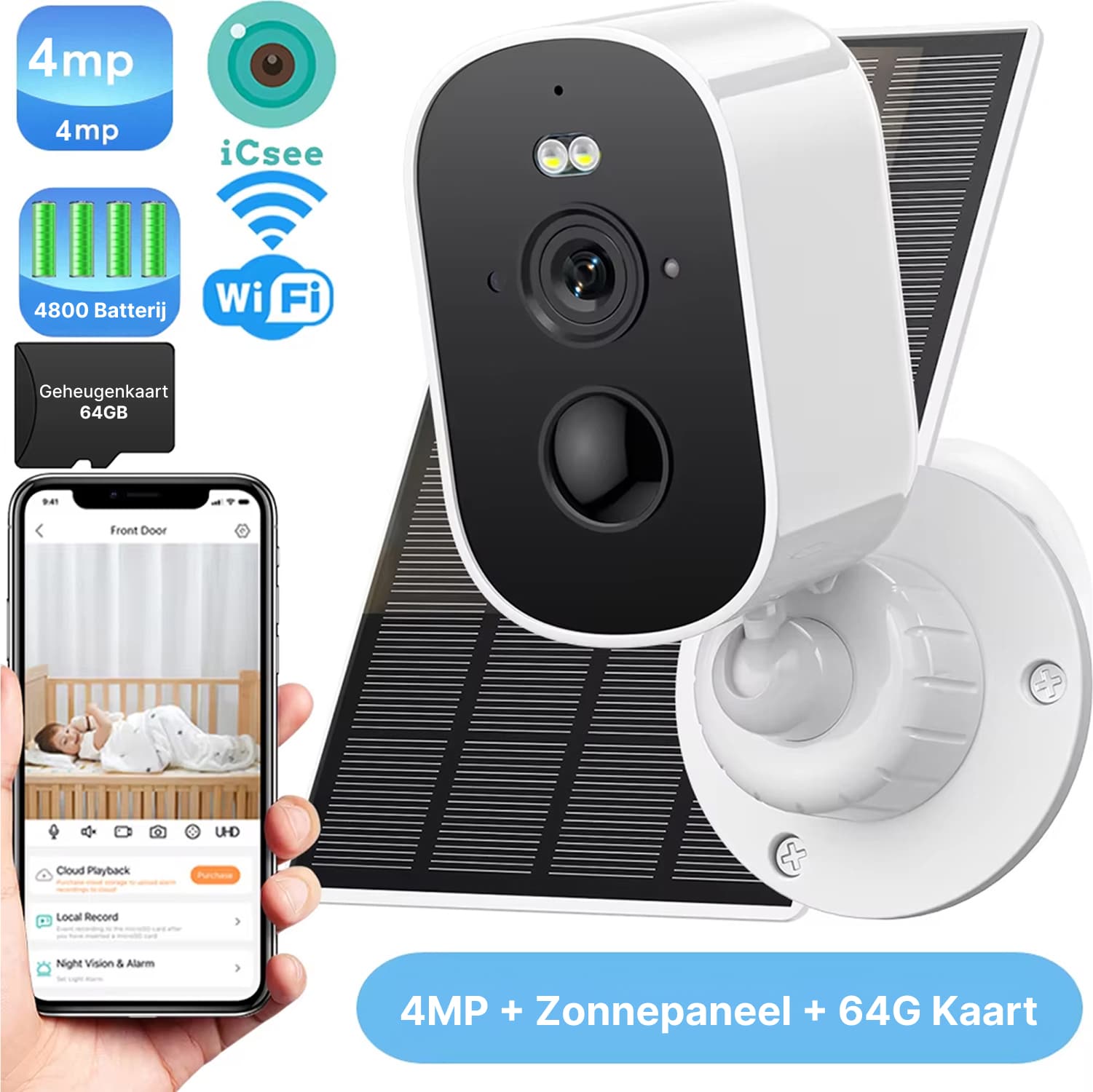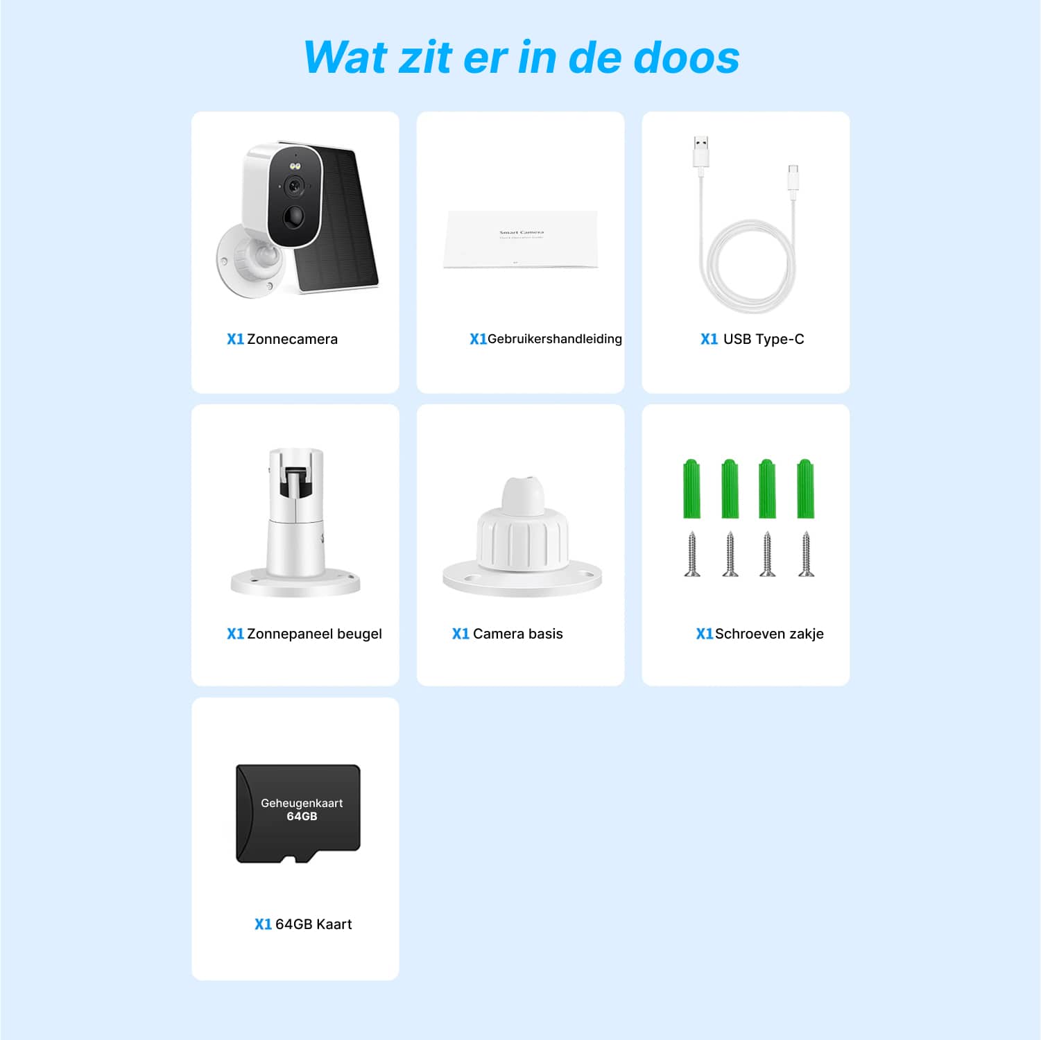 Voor continue 24/7 opname gedurende één week volstaat een 64GB SD-kaart ruimschoots. Bij bewegingsdetectie opname gebruikt u aanzienlijk minder opslag. De camera ondersteunt kaarten tot 128GB voor langere opslagperiodes zonder overschrijven.