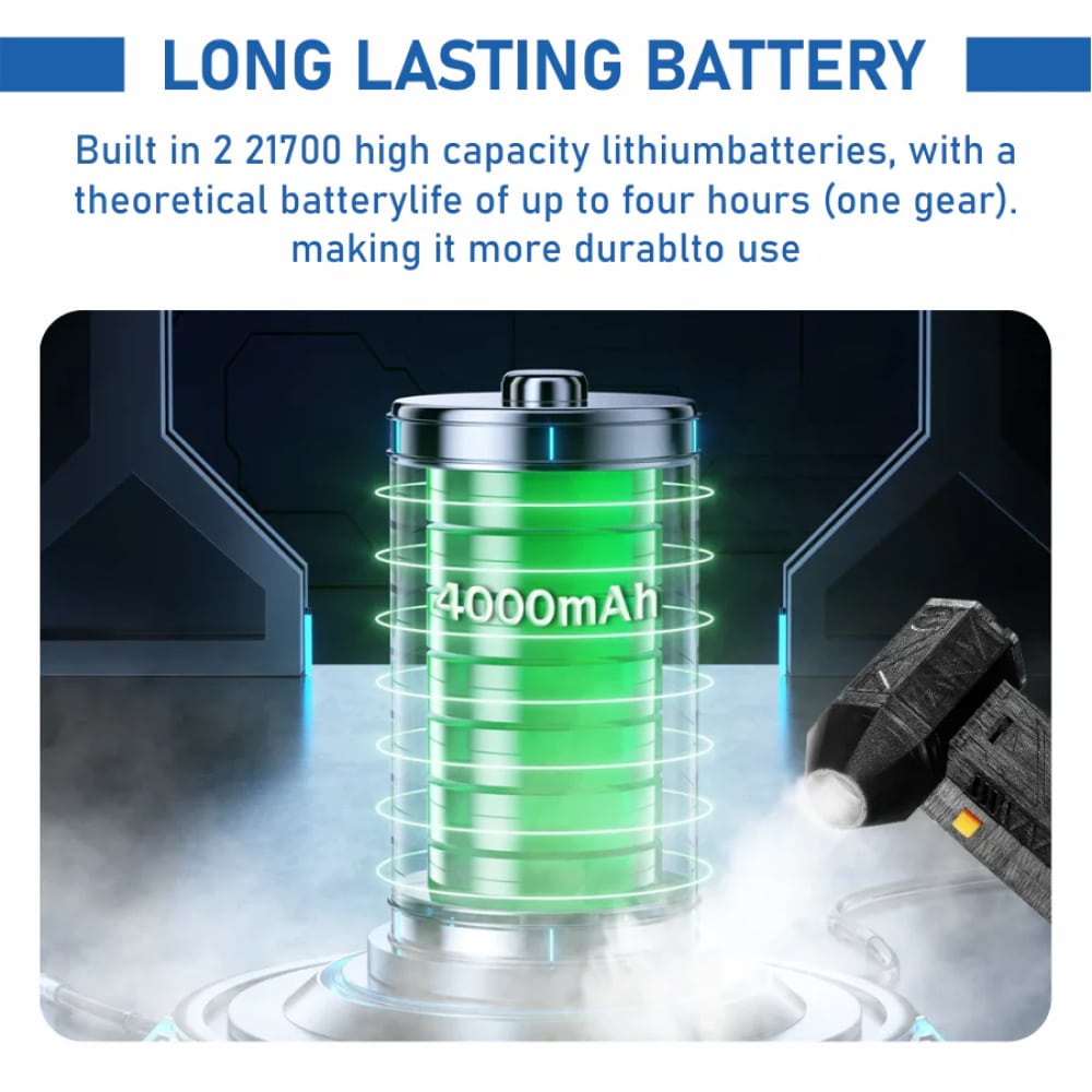 Dual 21700 lithium batteries provide up to 4 hours of continuous operation, ensuring complete cleaning sessions without interruption.
