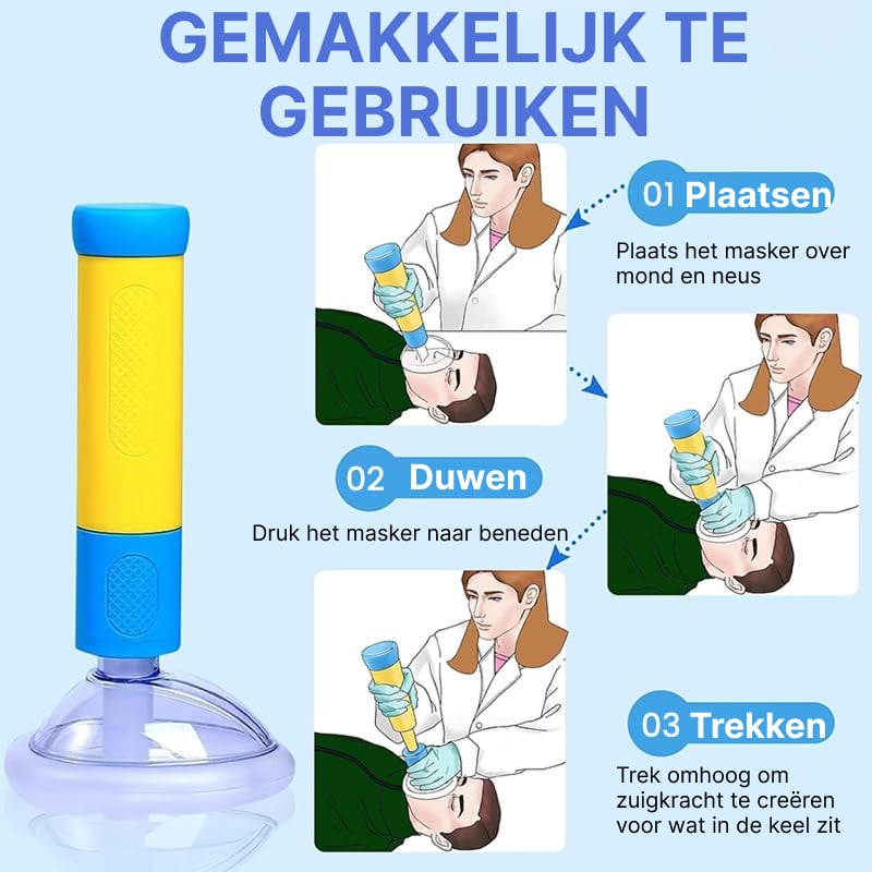 Ja, het Breathyox Anti-verstikking Apparaat is effectief bij zowel bewuste als bewusteloze slachtoffers. Bij bewusteloze personen plaats je het masker over neus en mond, zorg je voor goede afdichting en pas je dezelfde Plaatsen → Duwen → Trekken techniek toe. De krachtige negatieve druk werkt onafhankelijk van de bewustzijnsstaat van het slachtoffer. Controleer na verwijdering van obstructie altijd de ademhaling en overweeg reanimatie indien nodig.