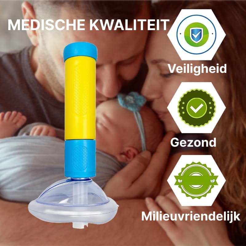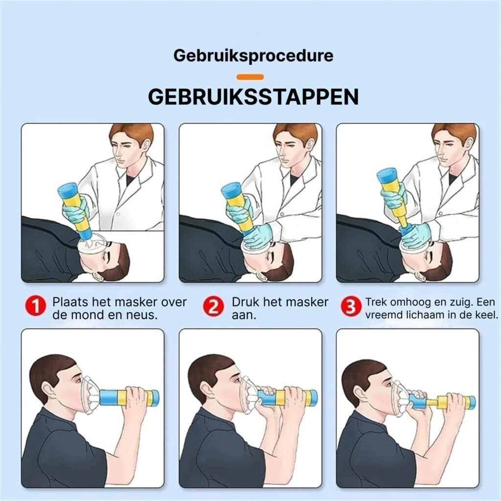 Het Breathyox Anti-verstikking Apparaat is ontworpen voor hergebruik en gemakkelijk onderhoud. Na gebruik demonteer je het masker en de onderdelen, spoel je ze af met warm water en milde zeep, en desinfecteer je met alcoholoplossing of desinfectiemiddel. Laat alle onderdelen volledig drogen voor opslag. Bij juist onderhoud gaat het apparaat jaren mee en blijft het betrouwbaar voor toekomstige noodsituaties.