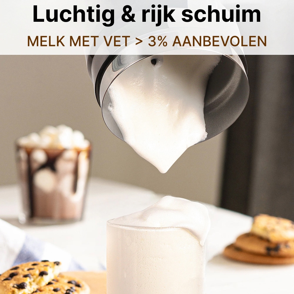 Voor optimaal schuim raden we volle melk aan met minimaal 3% vetgehalte. Dit geeft het rijkste en meest stabiele microfoam voor perfecte warme chocolademelk en cappuccino's.