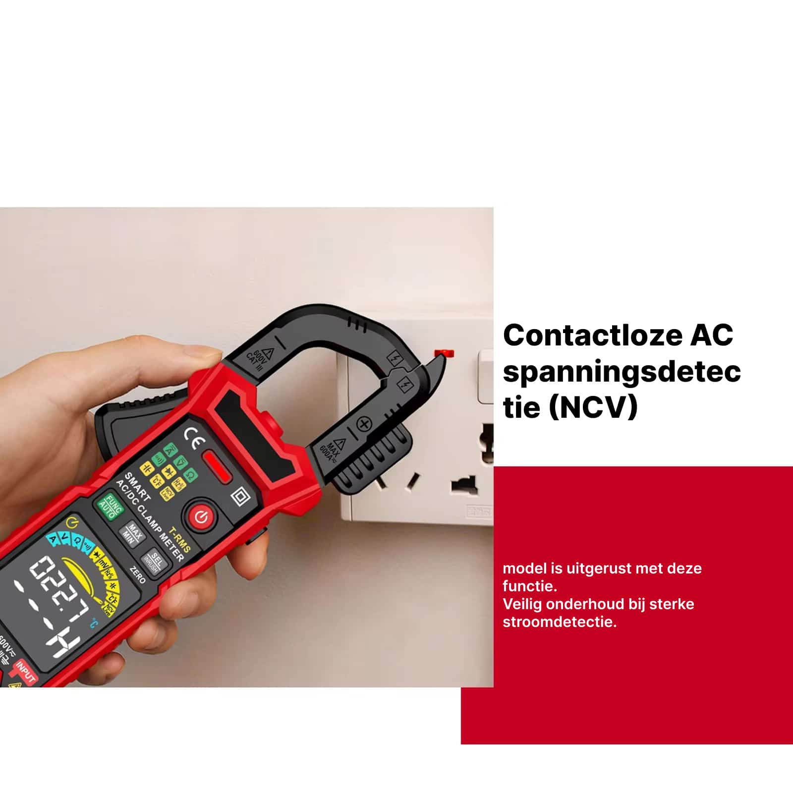 De NCV functie detecteert spanning zonder fysiek contact. Houd de meter bij een kabel en hij waarschuwt met geluid en licht wanneer spanning aanwezig is.