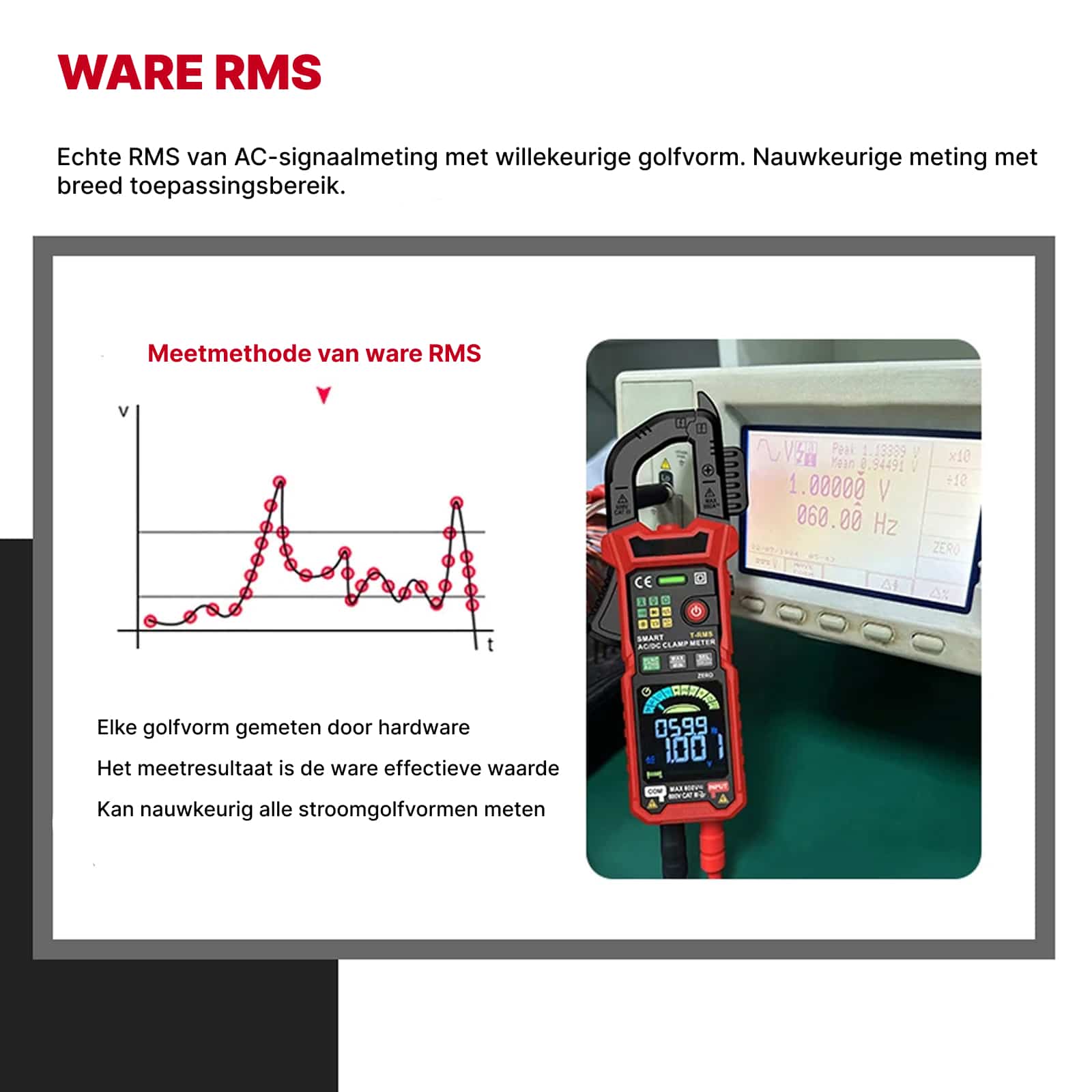 True RMS meet de werkelijke effectieve waarde van AC signalen, ongeacht de golfvorm. Dit geeft nauwkeurige resultaten bij moderne elektronica met niet-sinusvormige stromen.