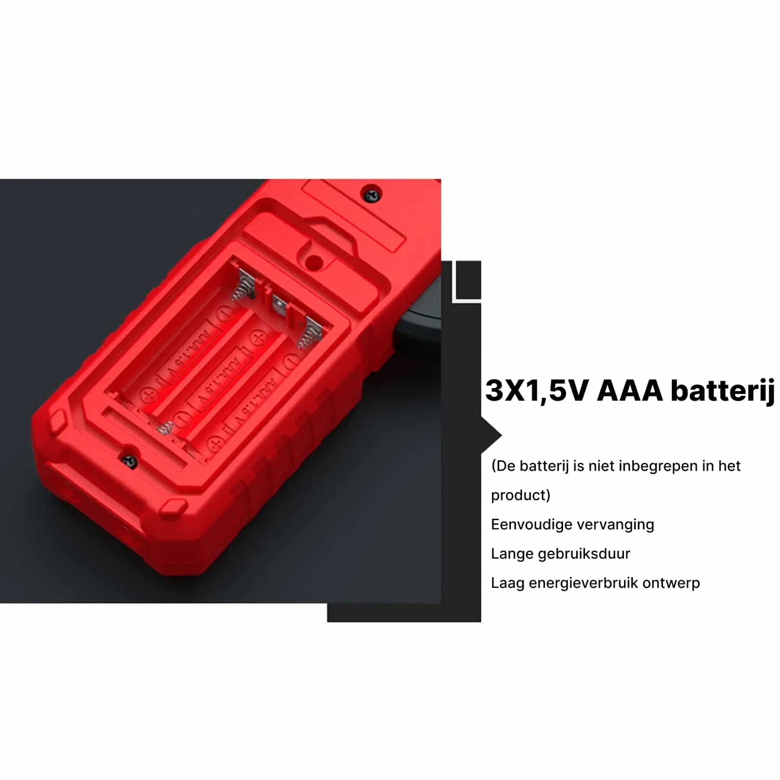 Het apparaat gebruikt 3x AAA batterijen (niet meegeleverd). Dankzij het energiezuinige ontwerp en automatische uitschakelfunctie gaan batterijen lang mee bij normaal gebruik.