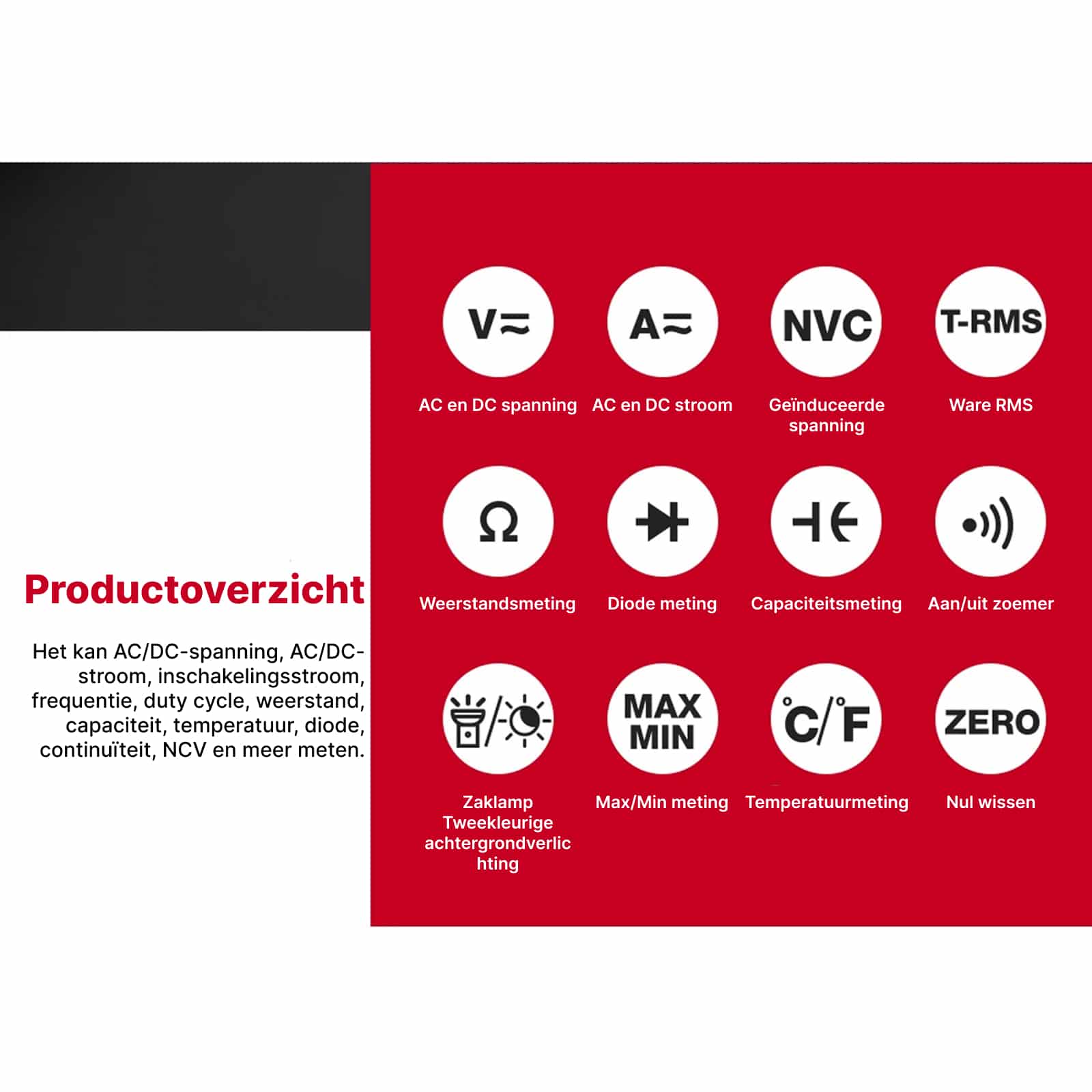 Ja, inclusief K-type temperatuursonde. Meet van -40°C tot 1000°C in zowel Celsius als Fahrenheit, handig voor thermische controles bij elektrische installaties.