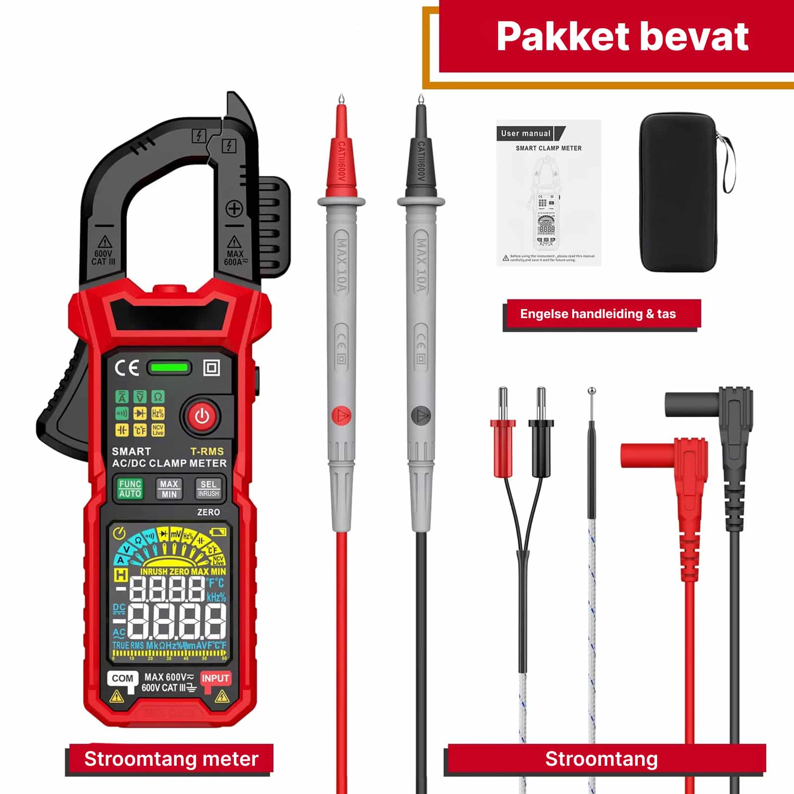 U ontvangt de stroomtang, meetpennen, temperatuursonde, Engelse handleiding en draagtas. Batterijen zijn niet inbegrepen maar verkrijgbaar bij elke winkel.