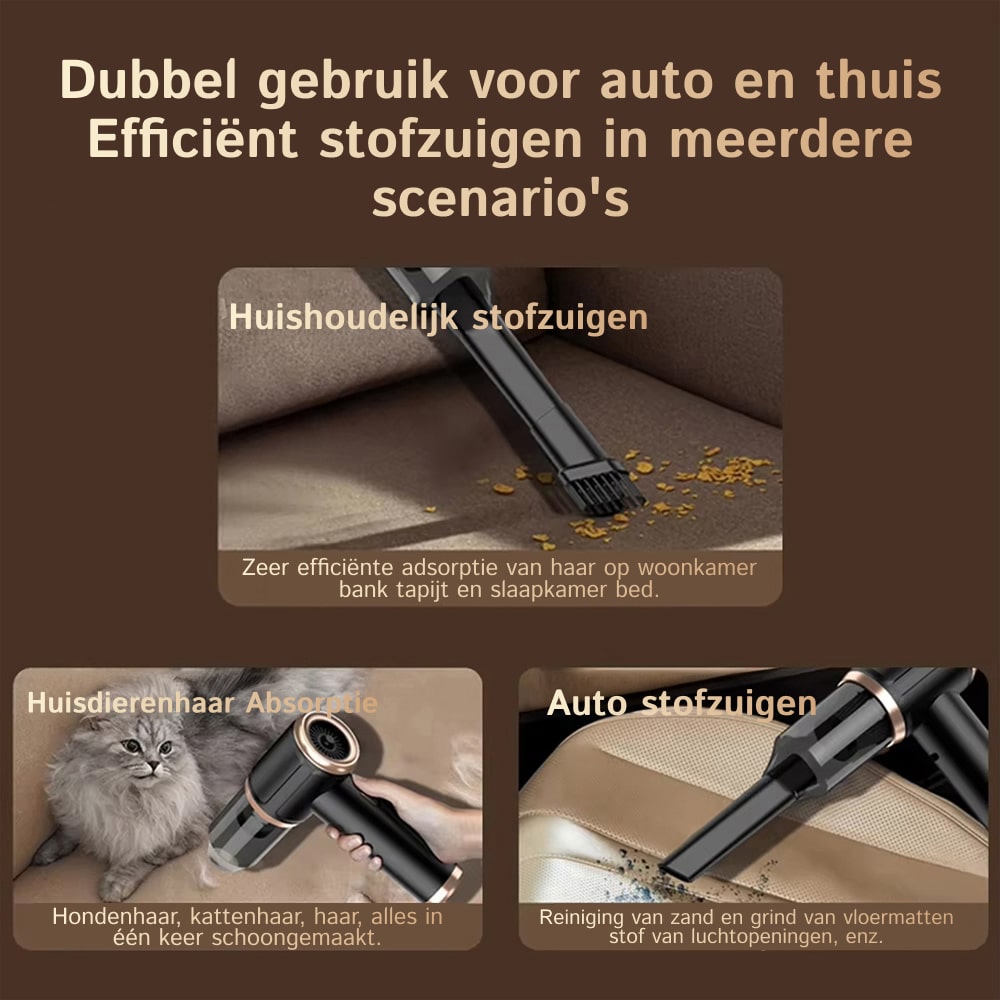 “Ik kocht ClinoVax voor auto schoonmaken maar gebruik het nu overal. De opblaas functie is verrassend nuttig, en de vloeistofextractie redde mijn toetsenbord van een koffieramp.”