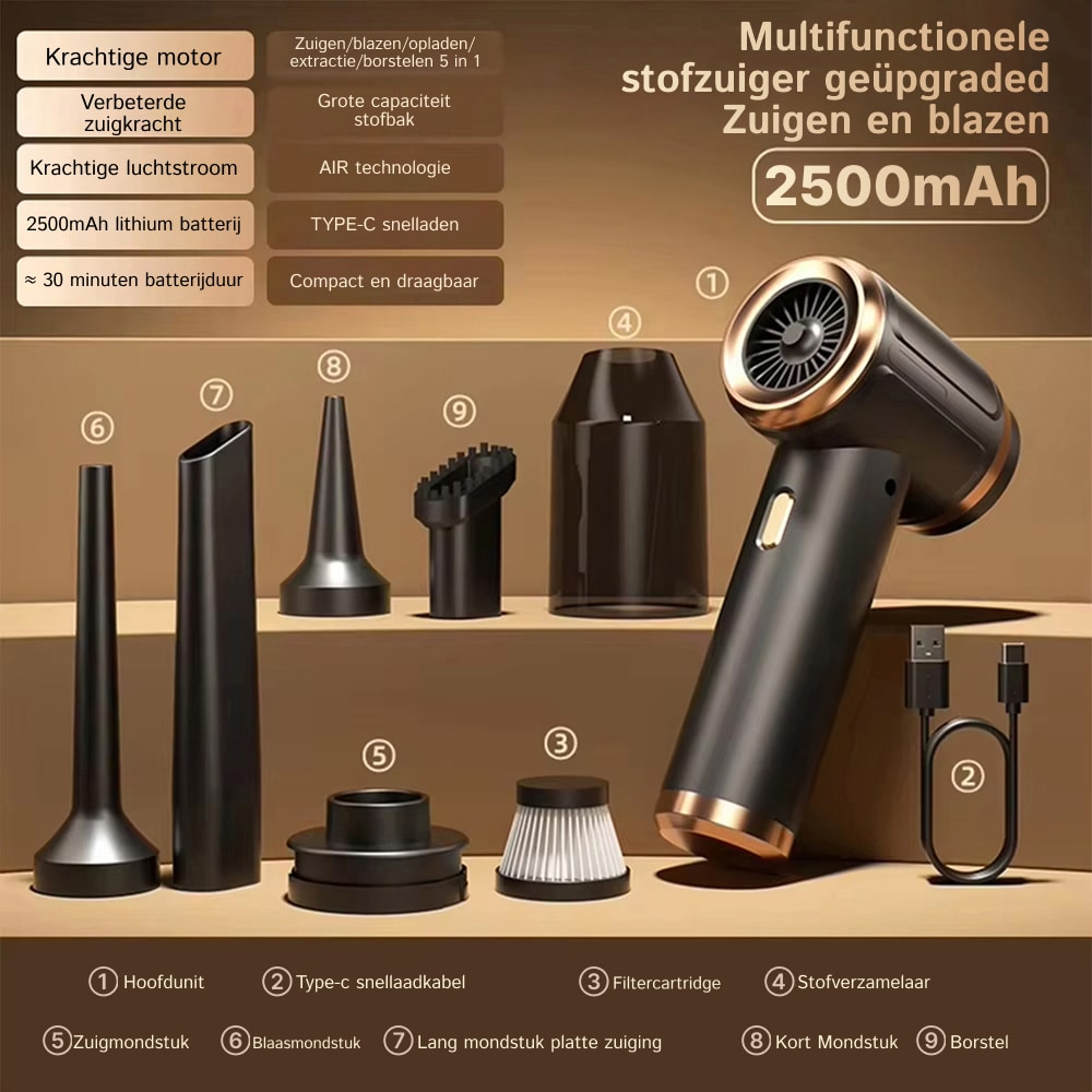 Uitgebreide multifunctionele capaciteit transformeert één apparaat in een compleet schoonmaakarsenaal met gespecialiseerde opzetstukken. Elke functie behandelt specifieke schoonmaakbehoeften, van precisiezuiging tot krachtig blazen, wat optimale resultaten verzekert voor verschillende oppervlakken en situaties.