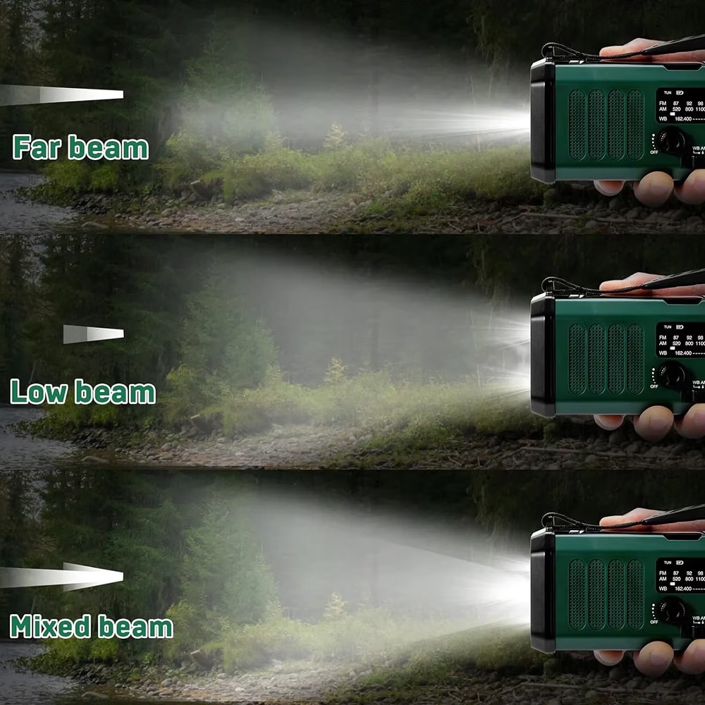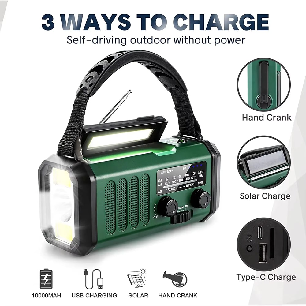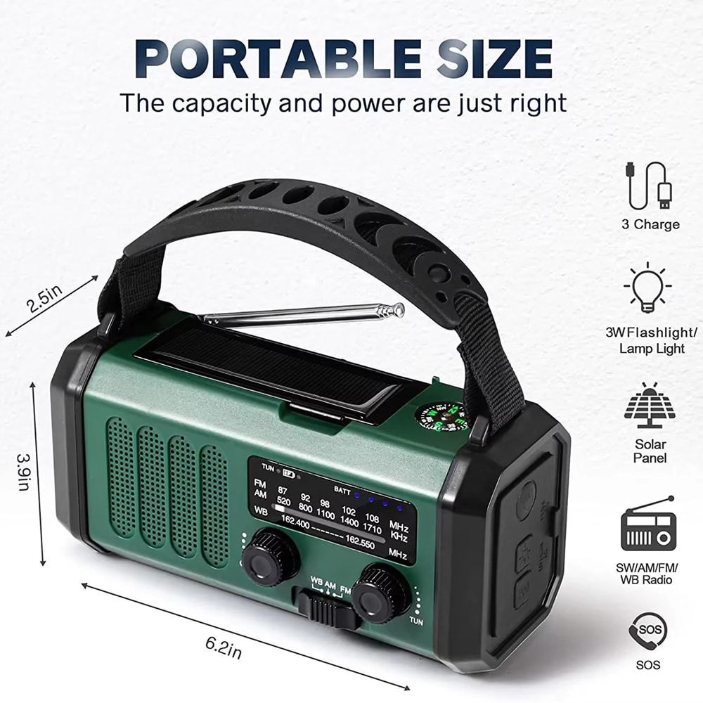 Receives AM (520-1710KHz), FM (87-108MHz), and NOAA weather bands for comprehensive emergency and entertainment broadcasting coverage.