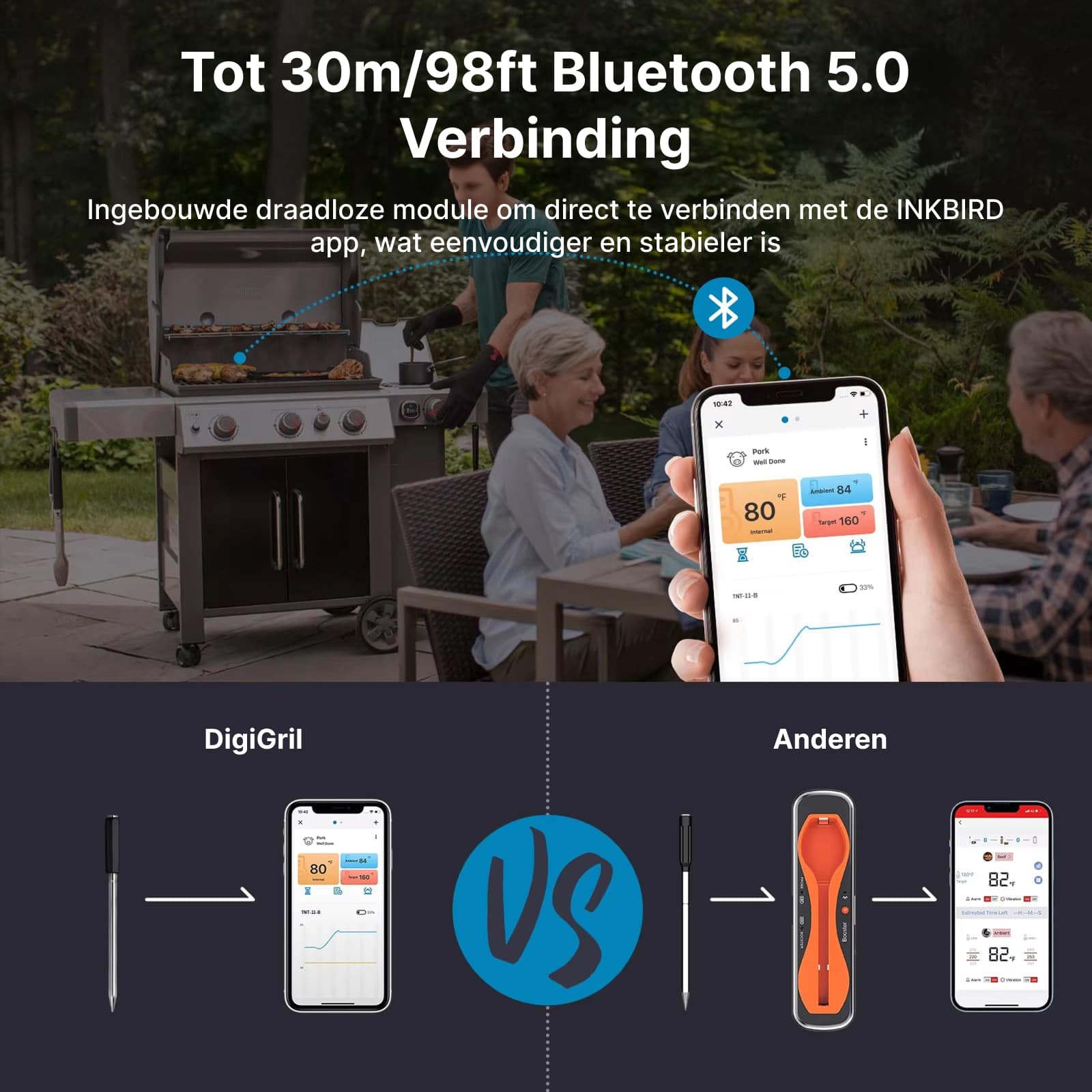 DigiGril heeft een Bluetooth-bereik tot 30 meter in open ruimte. Dit bereik kan variëren afhankelijk van muren en andere obstakels in uw huis.