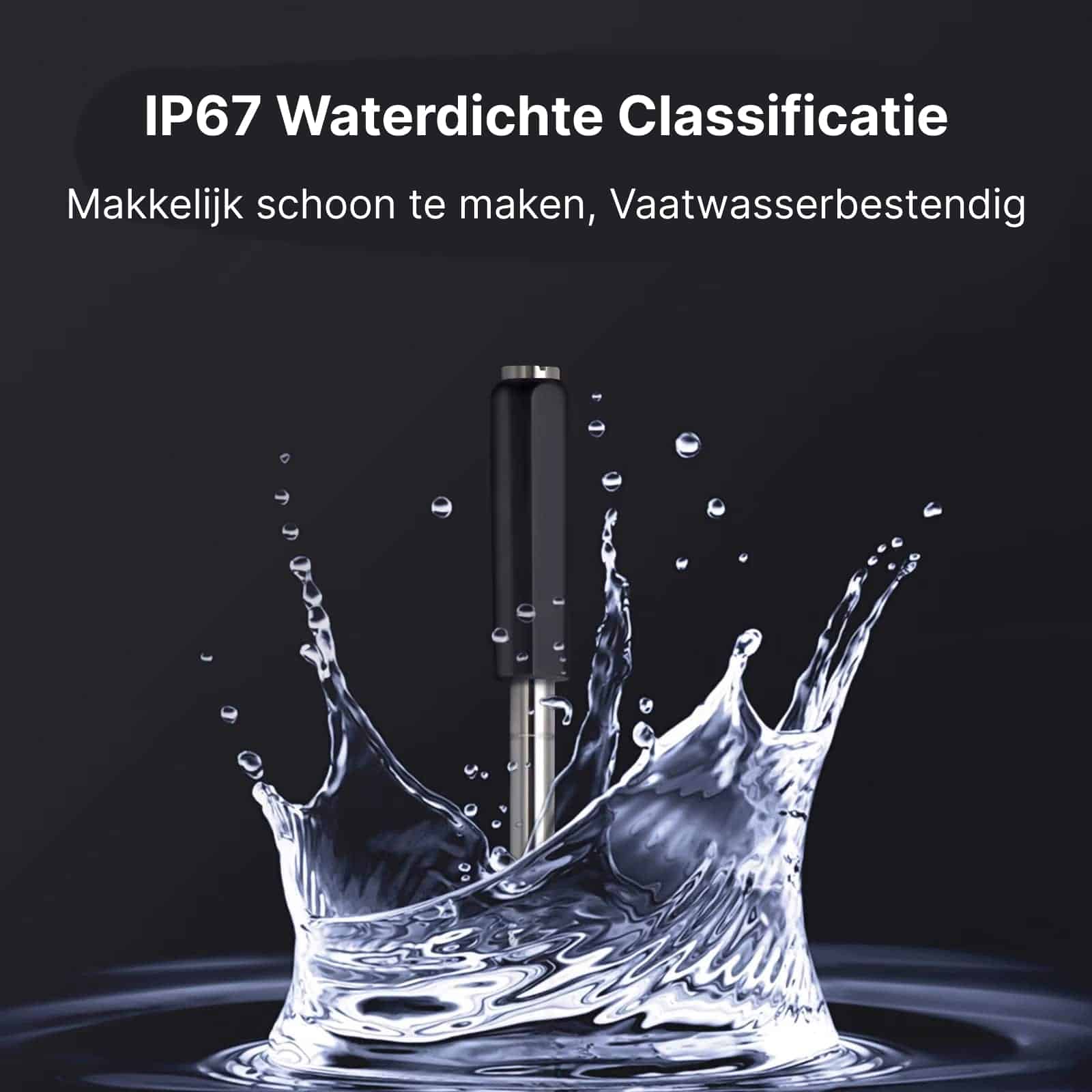 Ja, de sonde heeft een IP67 waterdichte classificatie en is volledig vaatwasserbestendig. Dit maakt reiniging eenvoudig en zorgt voor duurzaamheid.