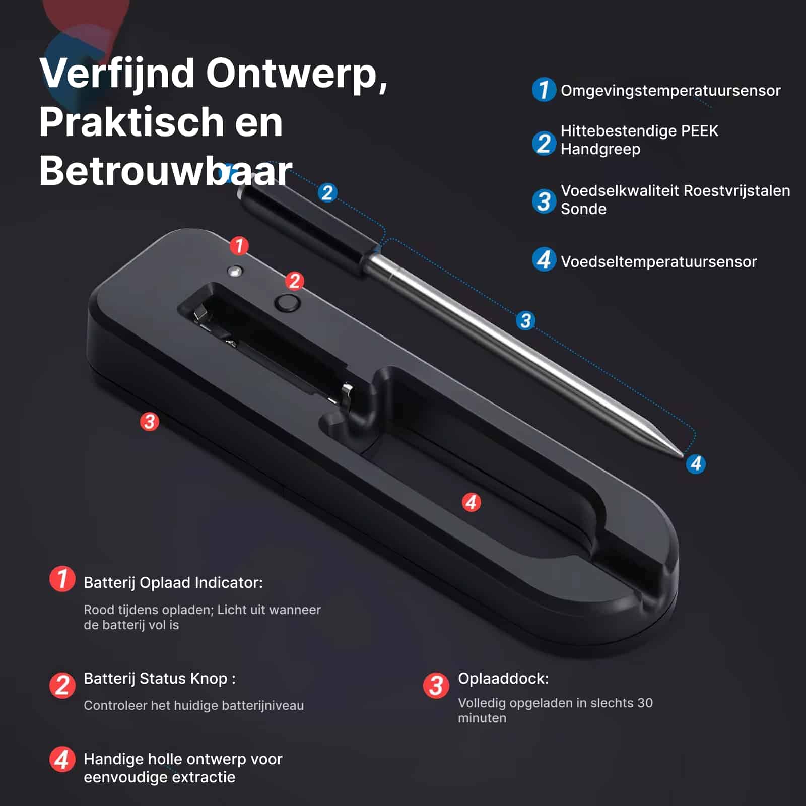 De DigiGril biedt tot 24 uur continue monitoring op een volledige lading. Met snelladen in 30 minuten bent u altijd klaar voor uw volgende kooksessie.