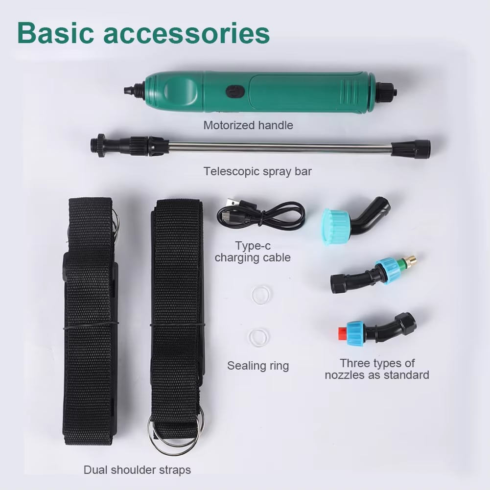 Your FlowiPack includes the sprayer, Type-C charging cable, shoulder straps, three spray heads, two sealing rings, and an instruction manual for quick setup.