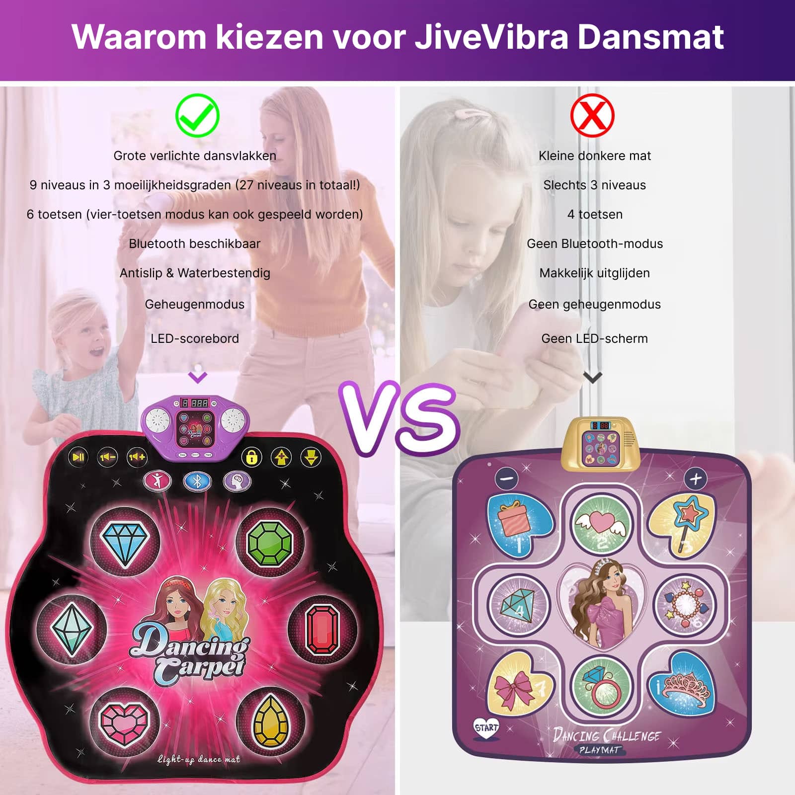 JiveVibra dansmatten zijn ontworpen voor kinderen vanaf 3 jaar tot volwassenen. De meerdere moeilijkheidsgraden en spelmodi maken het geschikt voor verschillende leeftijden en vaardigheidsniveaus, waardoor het hele gezin kan genieten.