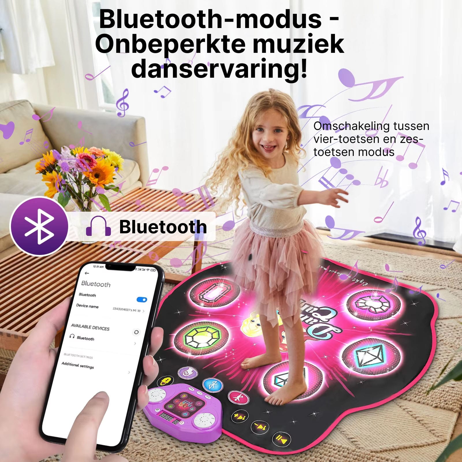 Absoluut! Via Bluetooth-connectiviteit kunt u eenvoudig uw favoriete muziek streamen vanaf smartphones of tablets. Dit maakt de ervaring persoonlijker en leuker voor alle gebruikers tijdens het dansen en bewegen.