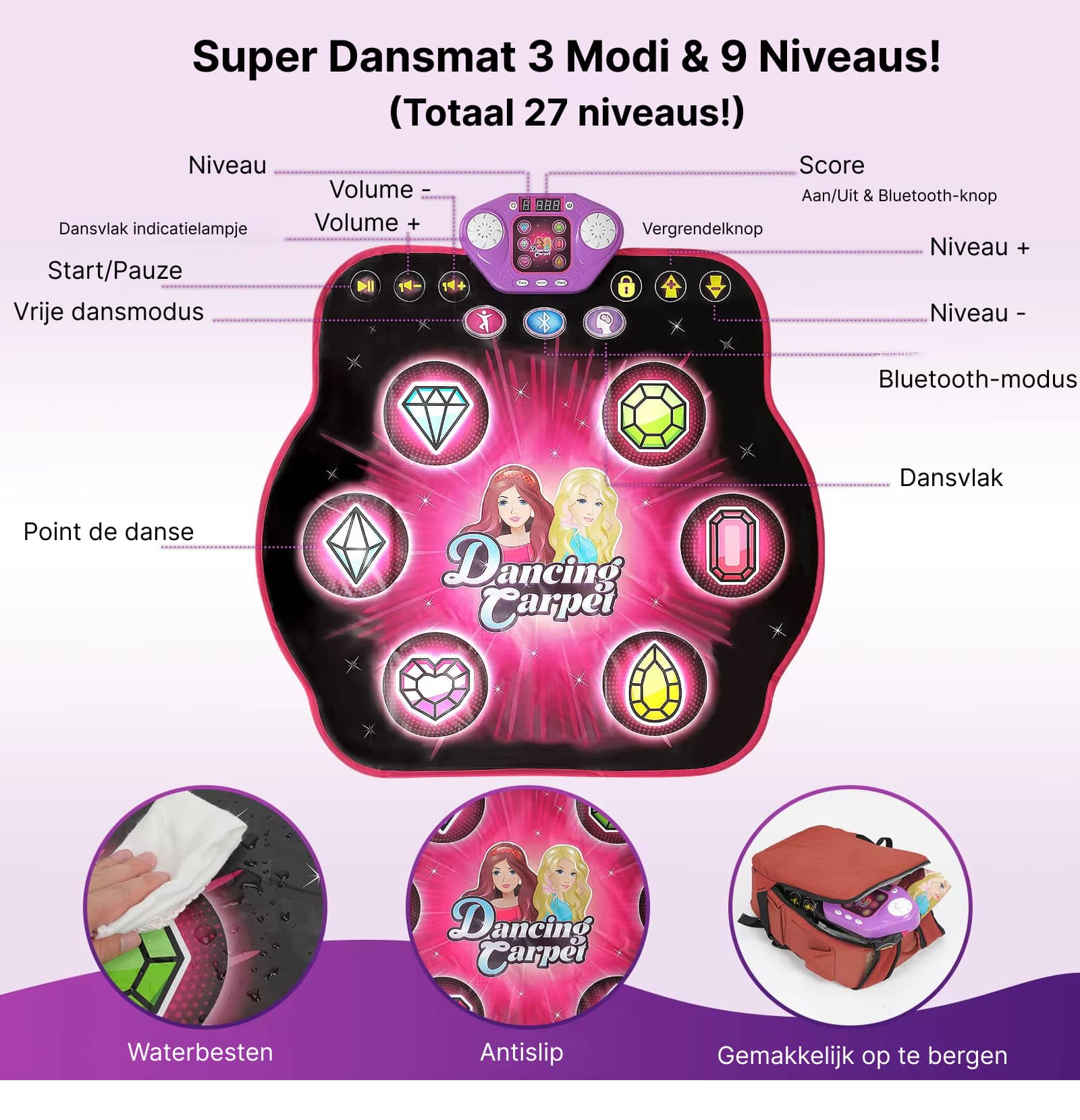 Ja, de dansmat heeft een antislip diamantpatroon onderkant die stabiel blijft op harde vloeren, tapijt en laminaat. De waterdichte constructie beschermt zowel de mat als uw vloer tegen vocht en slijtage.
