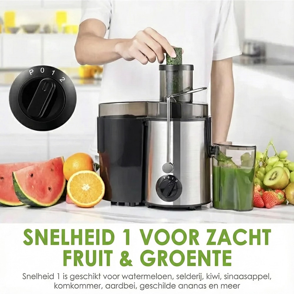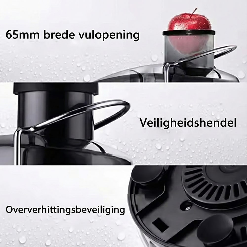 De Juicilox verwerkt de meeste producten: snelheid één voor zacht fruit zoals watermeloen, sinaasappels en aardbeien; snelheid twee voor harder fruit en groenten zoals appels, wortels en bieten. De krachtige 800W motor en 65mm voeropening accepteren veel hele vruchten, waardoor snijwerk tot een minimum wordt beperkt en voorbereidingstijd aanzienlijk wordt verkort.