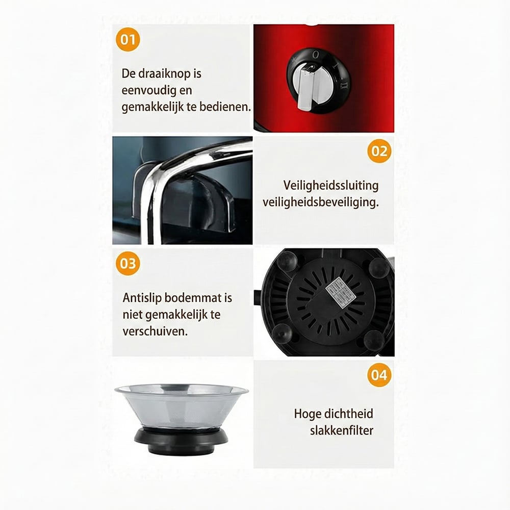 De Juicilox bevat meerdere veiligheidsvoorzieningen waaronder een vergrendelingsarm die voorkomt dat het apparaat werkt tenzij correct geassembleerd, antislip voetjes voor stabiliteit en een veilige duwstang. Hoewel ontworpen met veiligheid in gedachten, raden we toezicht door volwassenen aan voor kinderen onder de 12 jaar vanwege de krachtige motor en scherpe roestvrij stalen componenten.