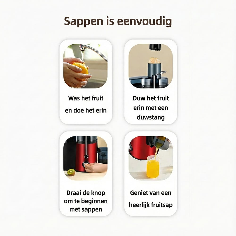 Het volledige sapcentrifugeproces voor één portie duurt doorgaans 30-60 seconden zodra het fruit is voorbereid. De brede 65mm voeropening elimineert het meeste snijwerk, waardoor voorbereidingstijd tot 1-2 minuten wordt verminderd. Inclusief reiniging kunt u vers sap genieten in minder dan 5 minuten totaal, waardoor het perfect is voor drukke ochtenden wanneer tijd kostbaar is.