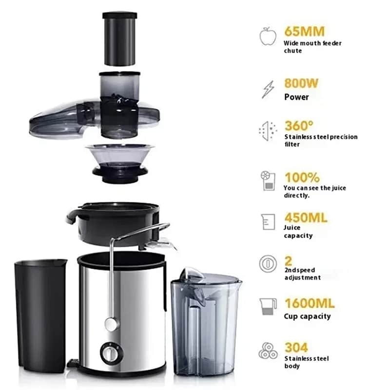 Juicing is fast: a serving takes 30–60 seconds. The 65mm chute accepts whole fruits, and the 800W motor works quickly. With brief cleanup, juice is ready in under three minutes.