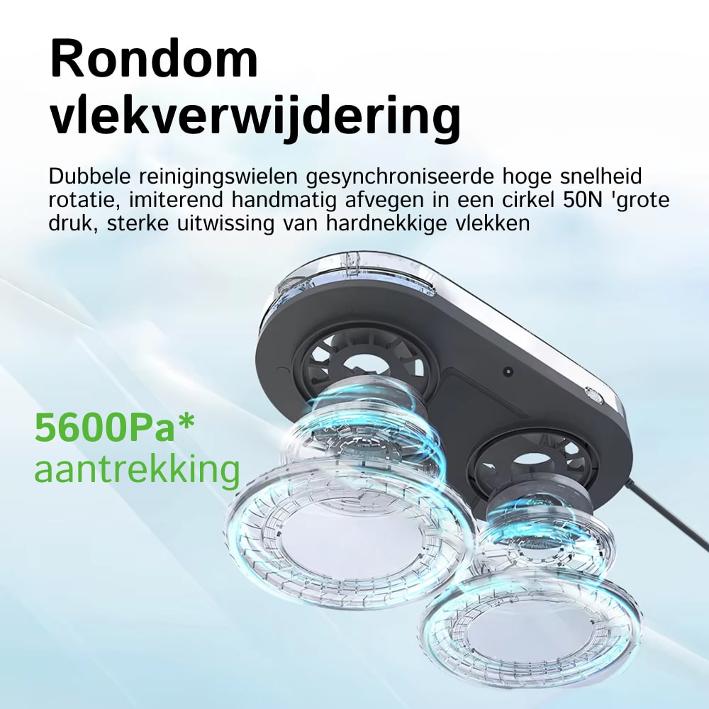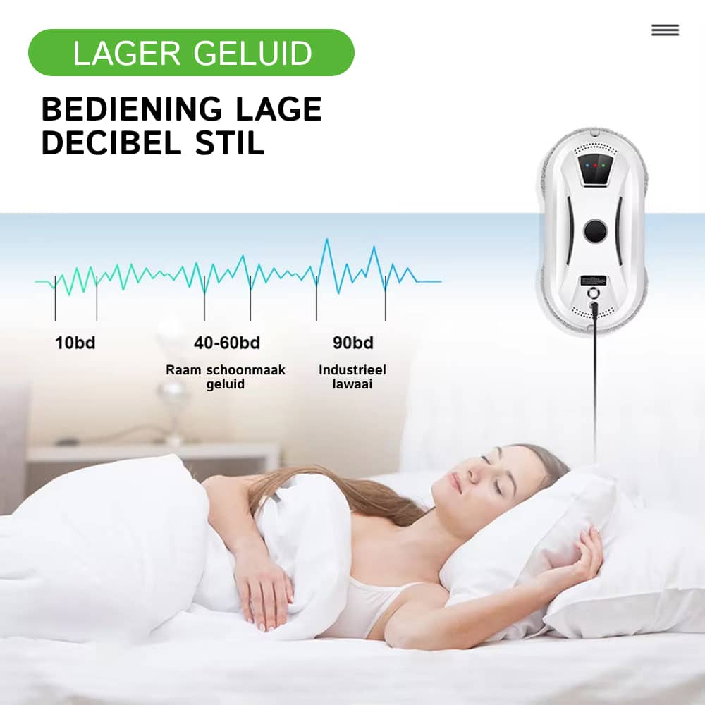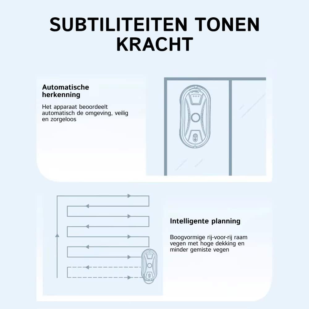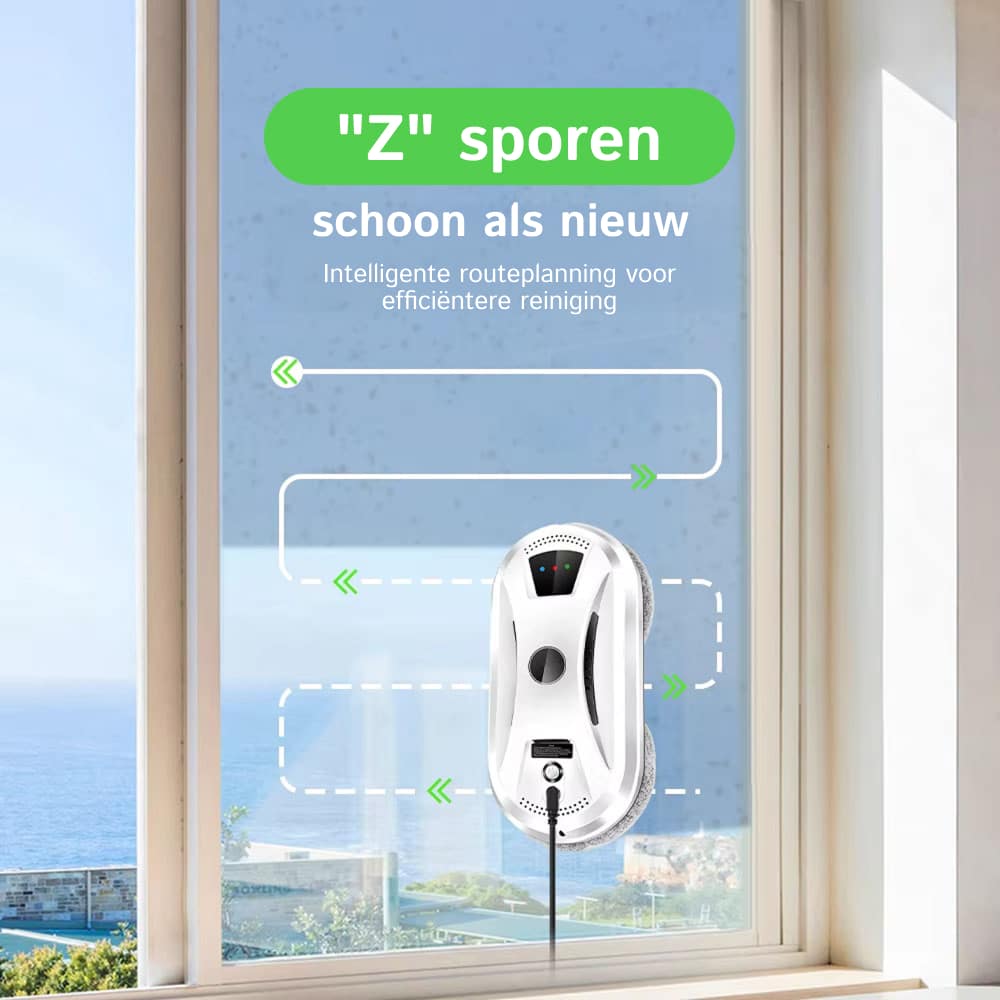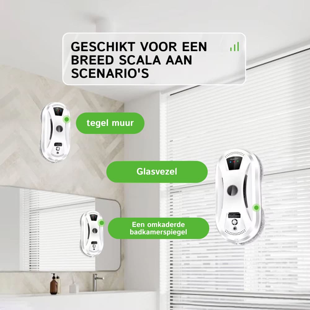 Ja, de Klearobo Robot Ramenwasser werkt perfect op alle gladde glasoppervlakken inclusief ramen, spiegels, tegels en glazen deuren. De 2800Pa zuigkracht zorgt voor stevige hechting op elk oppervlak.