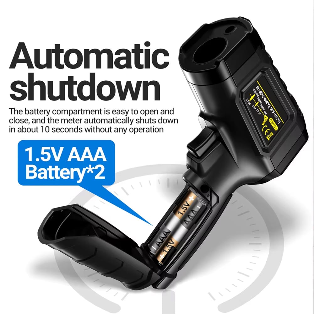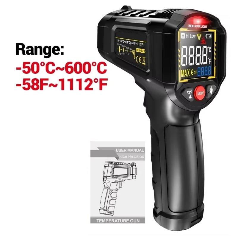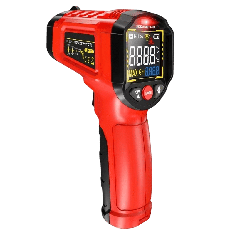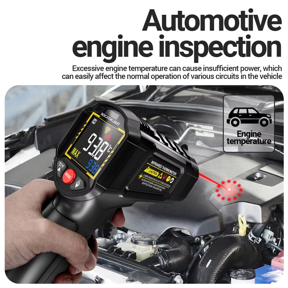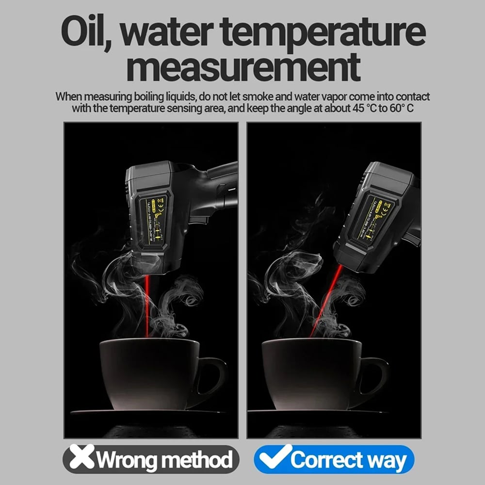 The Lazeriok measures temperatures from -50°C to 800°C (-58°F to 1472°F), covering virtually all industrial, automotive, and domestic applications. This wide range makes it suitable for everything from frozen goods to hot engines.