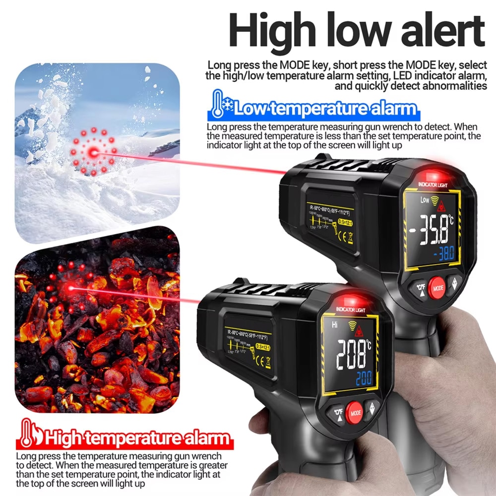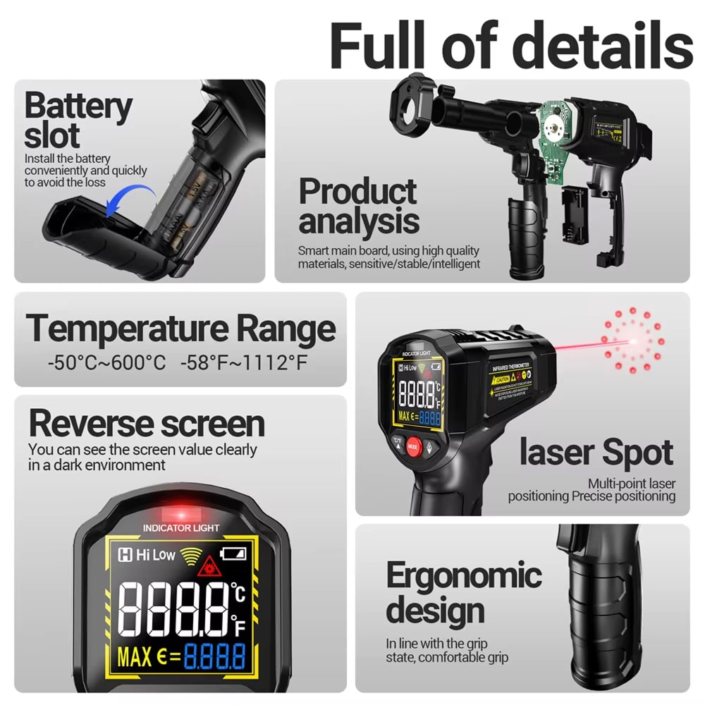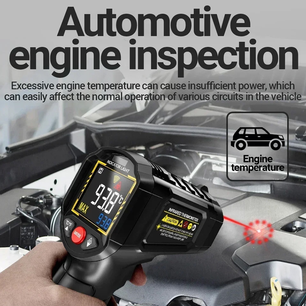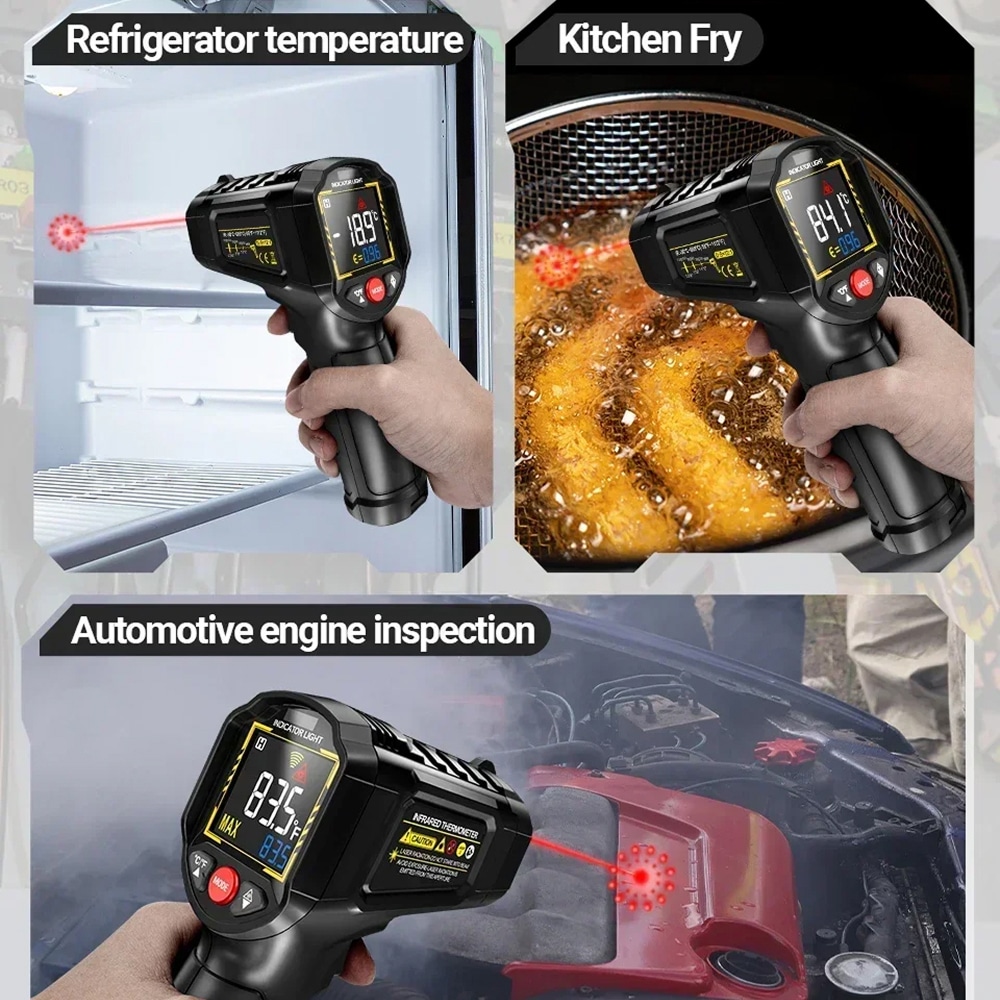 The Lazeriok measures temperatures from -50°C to 800°C (-58°F to 1472°F), covering virtually all industrial, automotive, and domestic applications. This wide range makes it suitable for everything from frozen goods to hot engines.