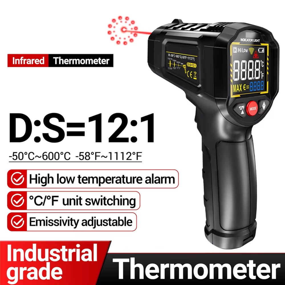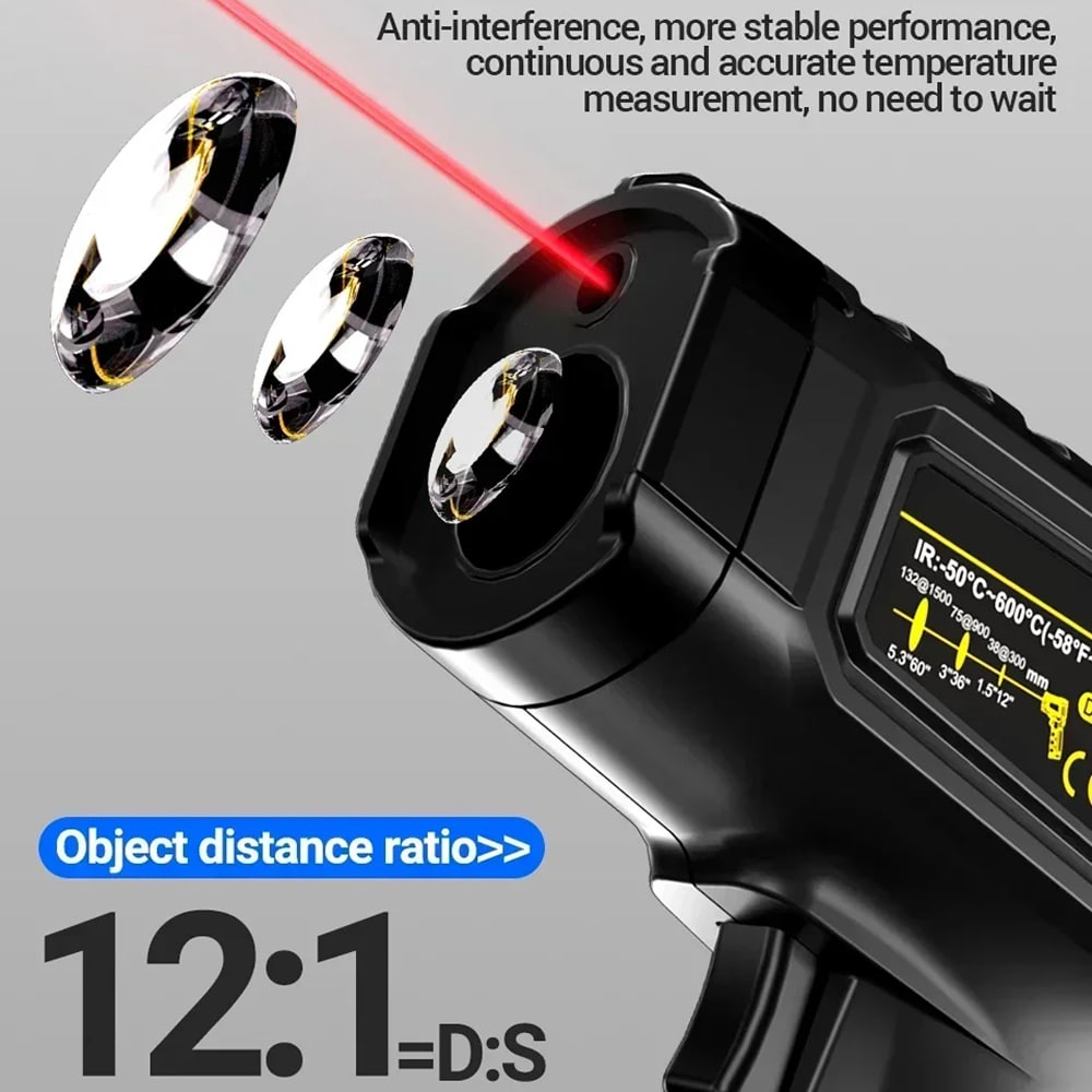 The 12:1 ratio means from 12 inches away, you measure a 1-inch diameter spot. From 24 inches, you measure a 2-inch spot. This allows safe distance measurements whilst maintaining accuracy.