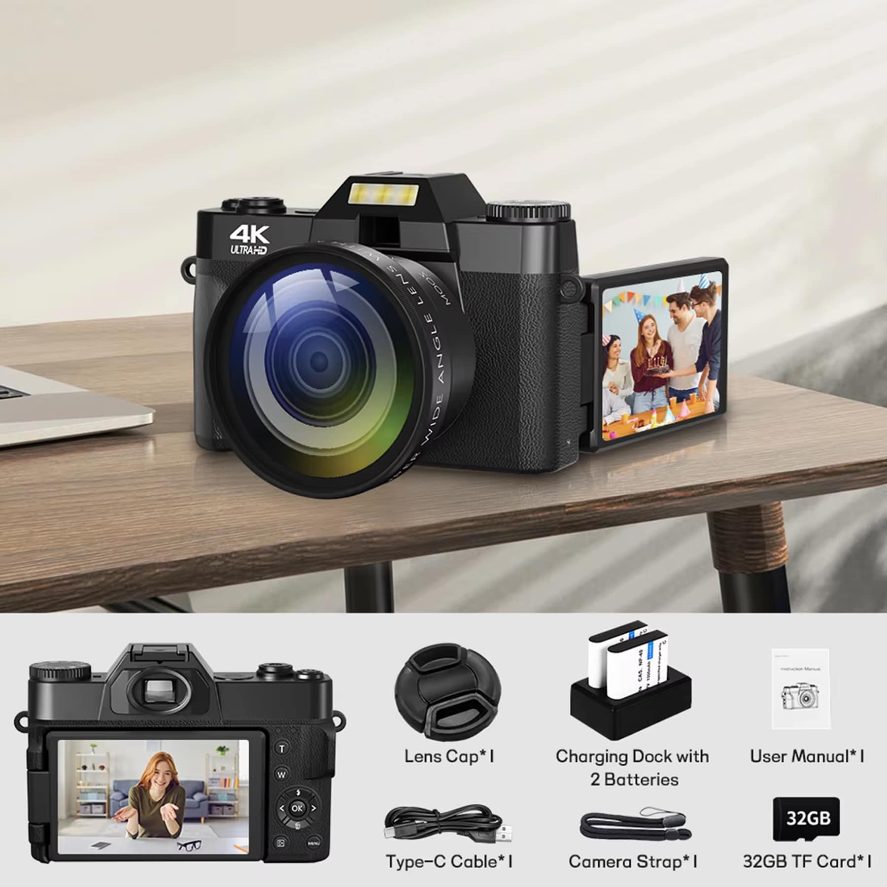 The camera comes with a 32GB TF card, two batteries, a Type-C cable, a wide-angle lens, a lens cap, a camera strap, and a user manual.