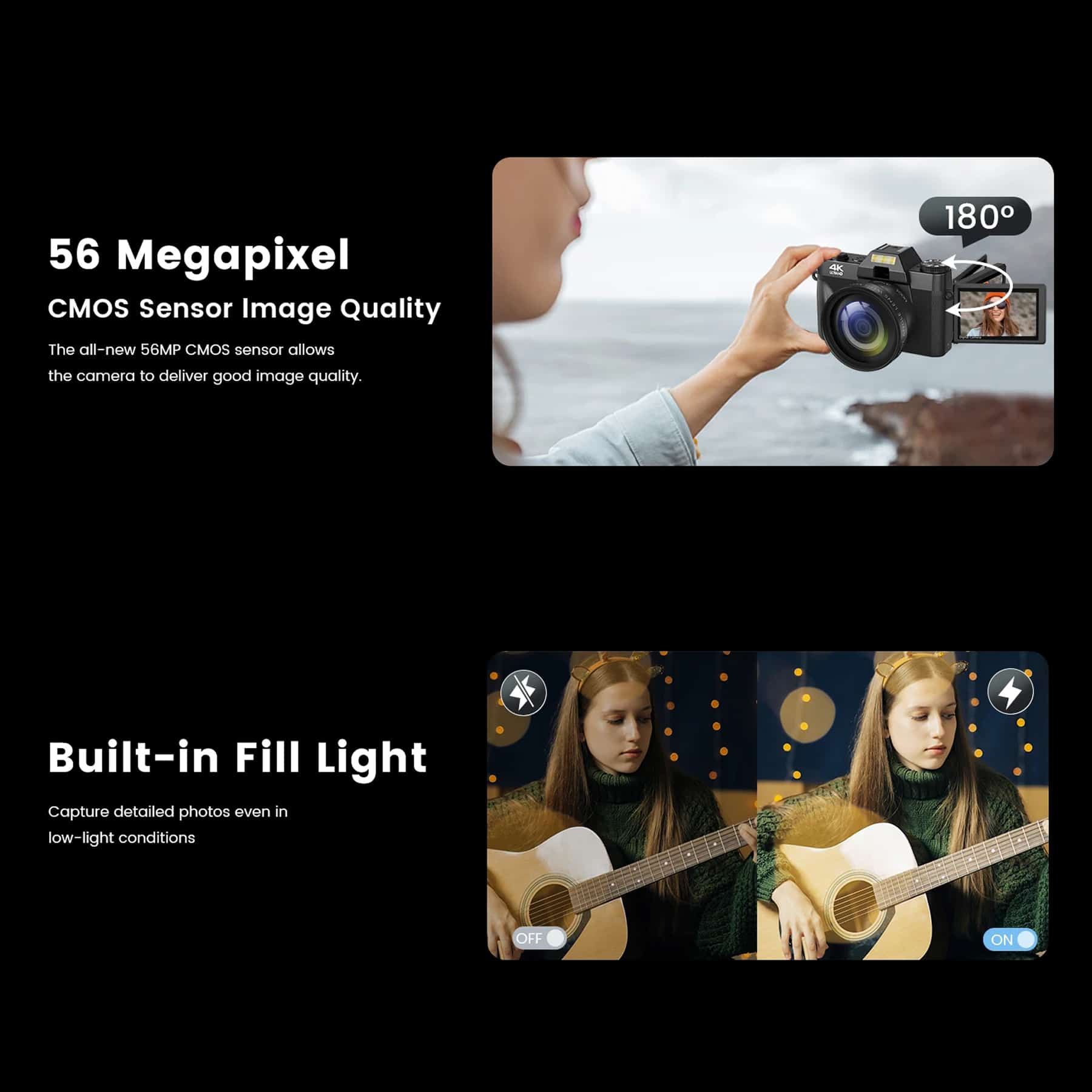 With a 56MP sensor and 4K video capability, the Lensiox DSLR Camera delivers stunning image quality. The built-in fill light ensures great results even in low-light conditions.