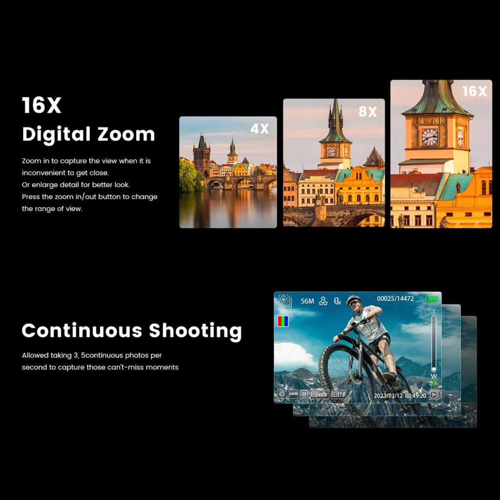 The 16X digital zoom allows you to get closer to your subject without losing too much detail, though optical zoom would provide better quality at high magnifications.