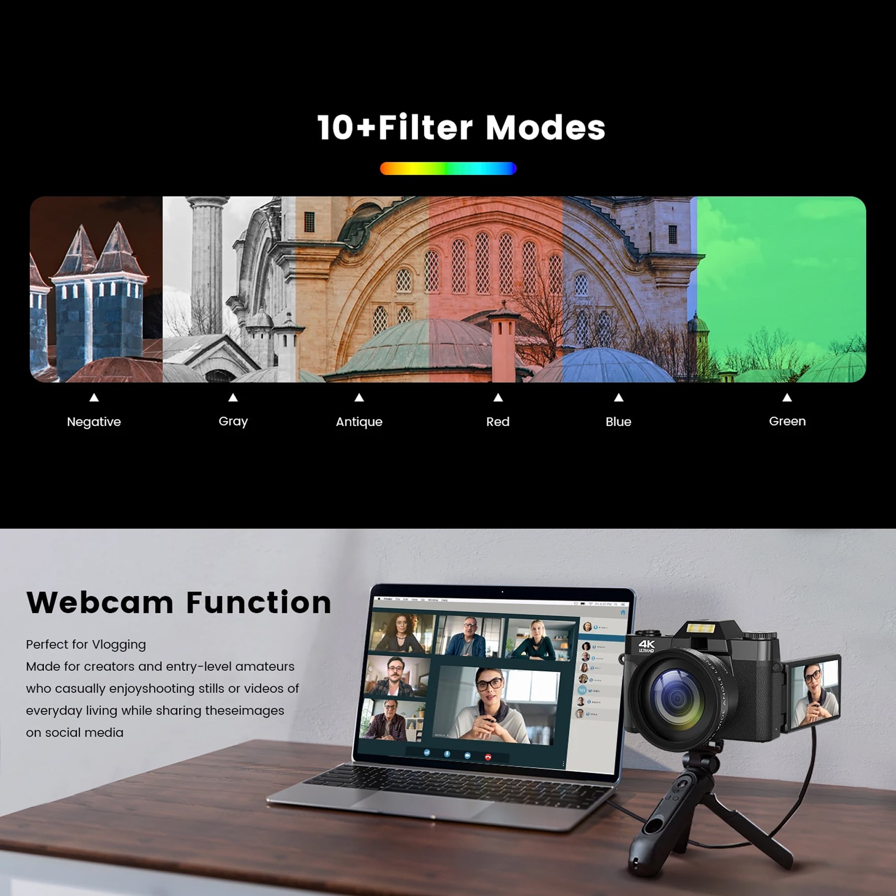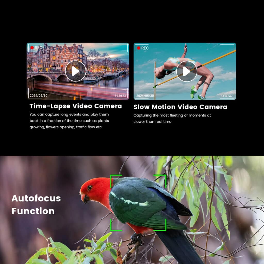 From 4K video recording to time-lapse and slow-motion modes, this camera offers a wide range of creative options. The included wide-angle lens and macro capabilities further enhance its versatility.