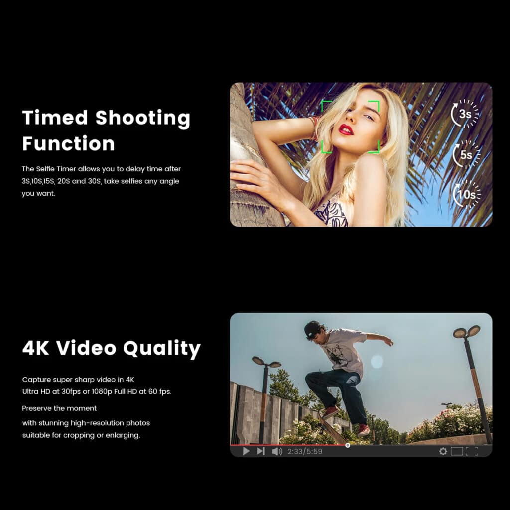 The camera supports 4K video at 30fps and 1080p Full HD at 60fps, providing high-quality options for different recording needs.