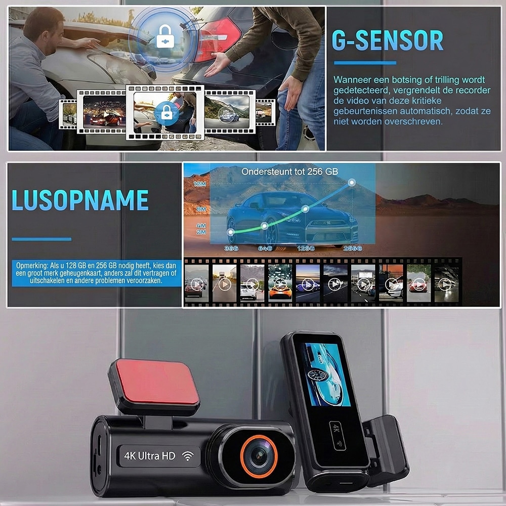 Voor dagelijks gebruik raden we minimaal 64GB aan, maar 128GB biedt meer opslagruimte voor langere trips. De loop-opname overschrijft automatisch oude beelden, behalve vergrendelde noodopnames door de G-sensor.