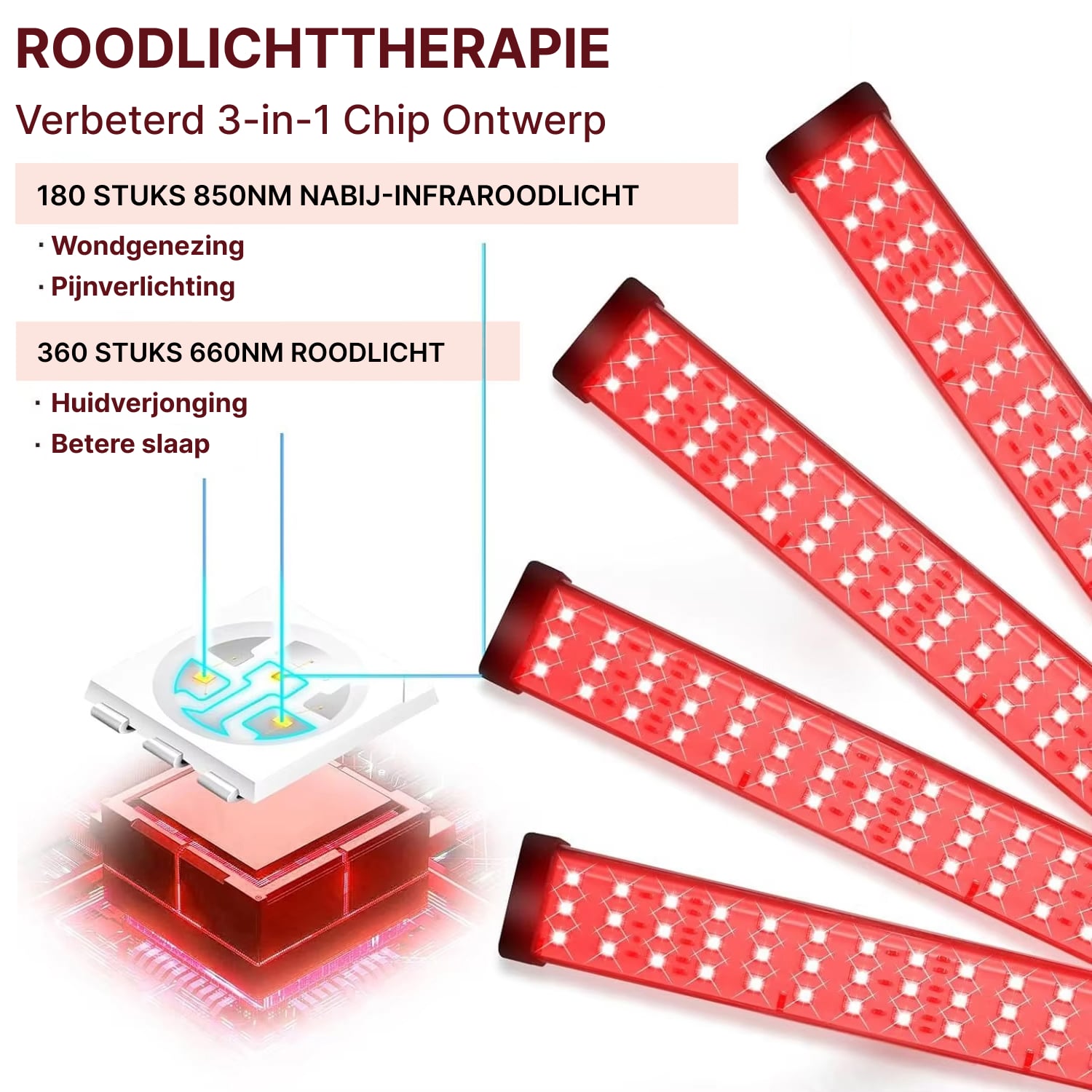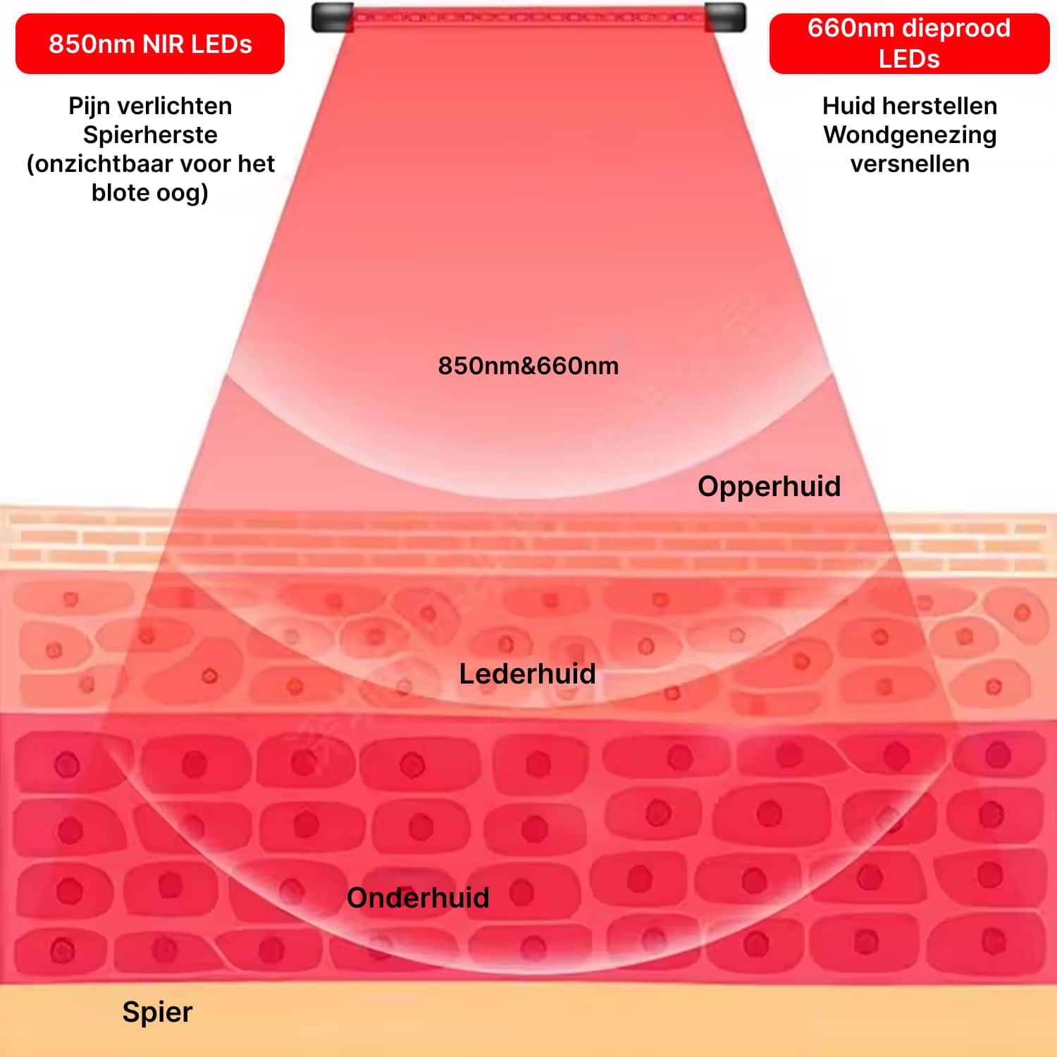 Nee, het 850nm nabij-infrarood licht is onzichtbaar voor het blote oog, maar werkt wel effectief. Alleen het 660nm rode licht is zichtbaar. U kunt beide golflengtes afzonderlijk of gecombineerd gebruiken voor complete therapie.
