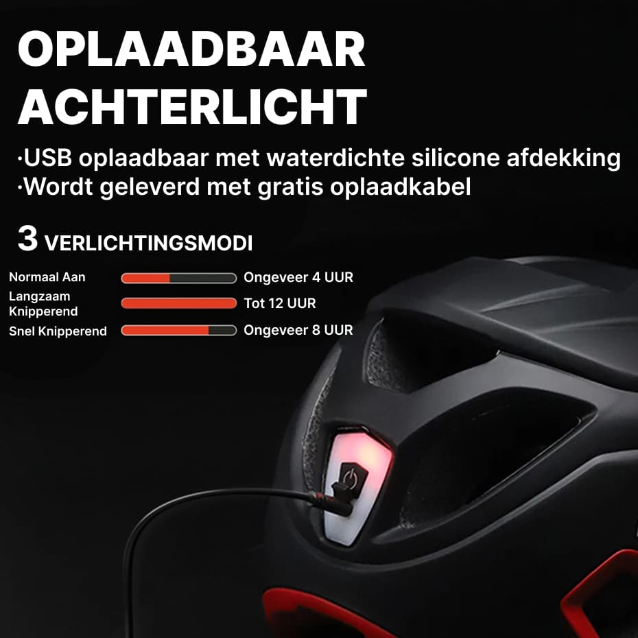 Bij volledig opgeladen biedt het LED-achterlicht maximaal 12 uur continue verlichting in de normale modus. Flitsmodi verbruiken minder energie en kunnen nog langer meegaan. Het USB-oplaadsysteem maakt snel en gemakkelijk opladen mogelijk binnen twee uur.