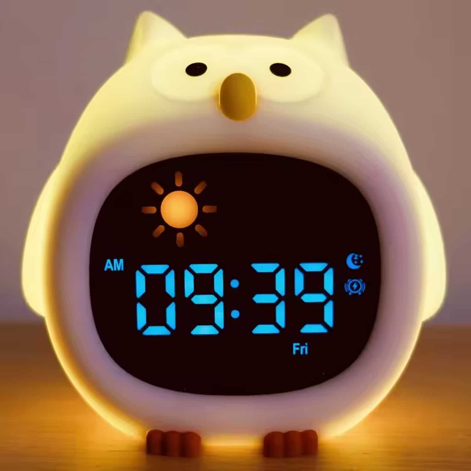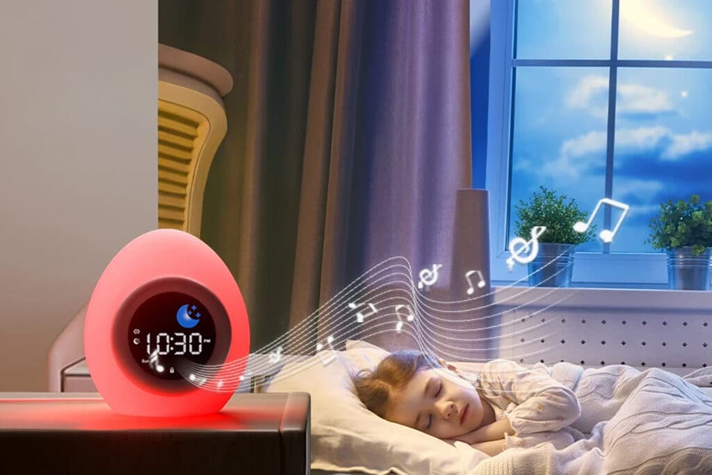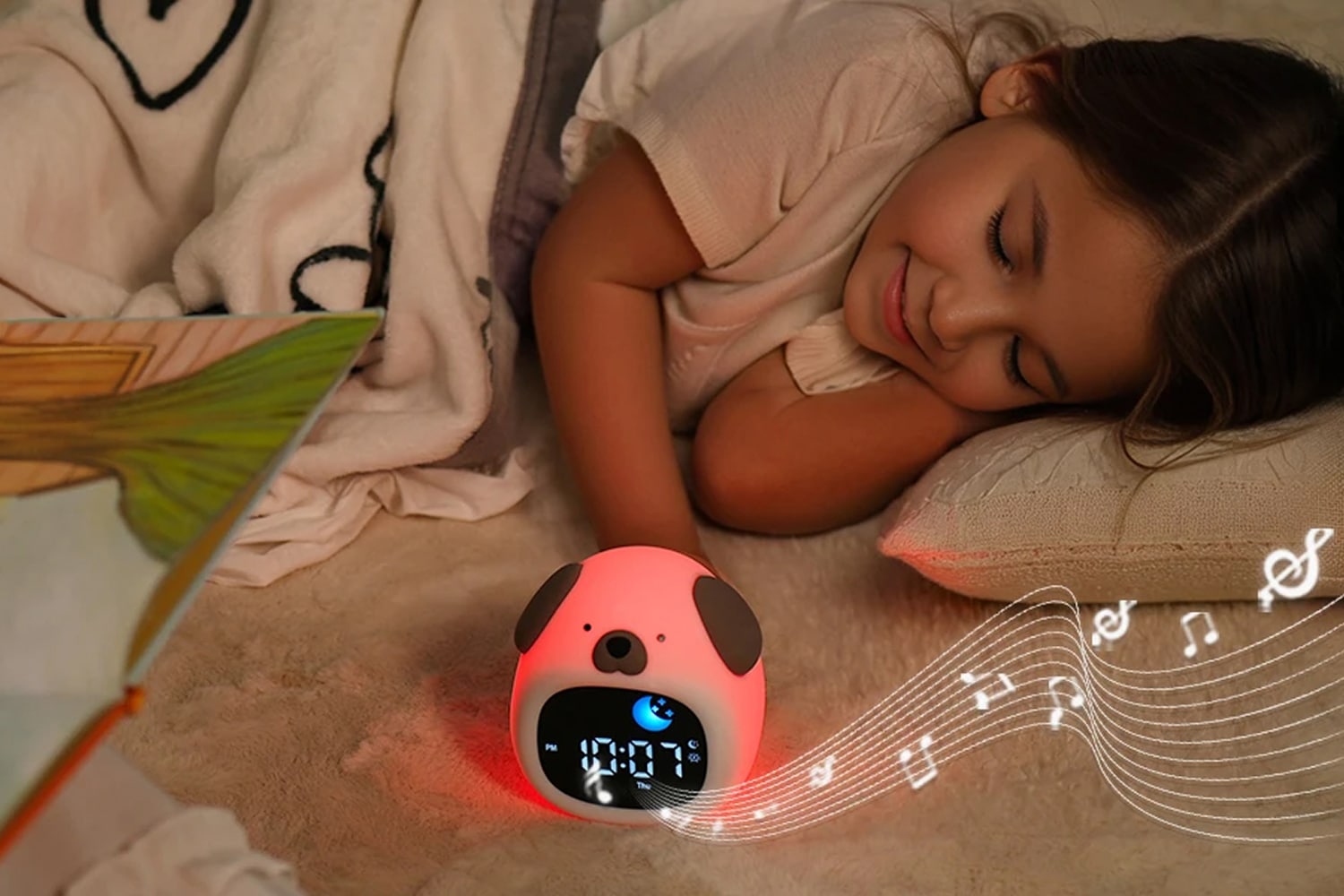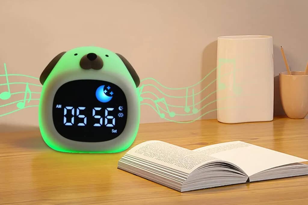 The MornoChan Alarm Clock uses visual cues like red and green lights to indicate bedtime and wake-up times, making sleep training intuitive for children.
