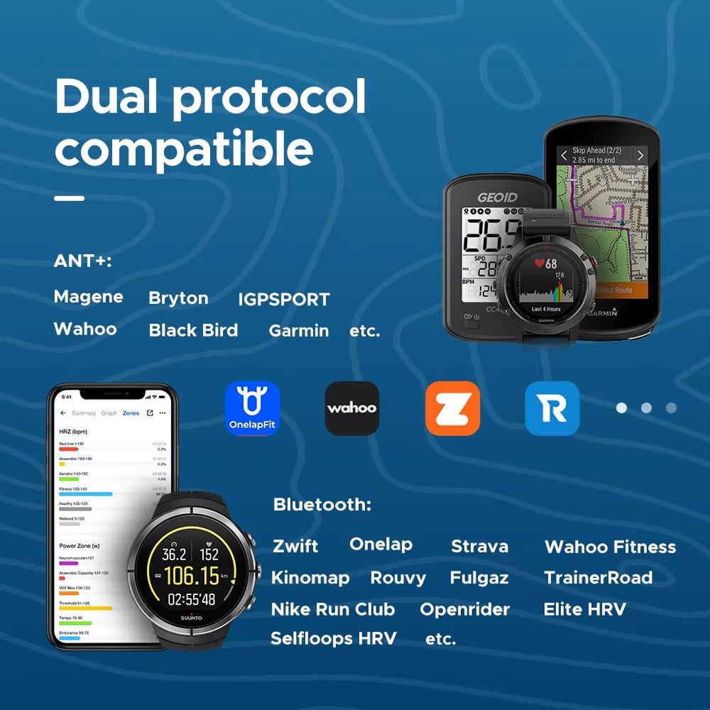 The NanoxBeat Heart Rate Strap features dual wireless connectivity through both Bluetooth 4.2 and ANT+ protocols. This compatibility ensures seamless integration with popular fitness apps, GPS watches, and smart equipment for comprehensive workout tracking.