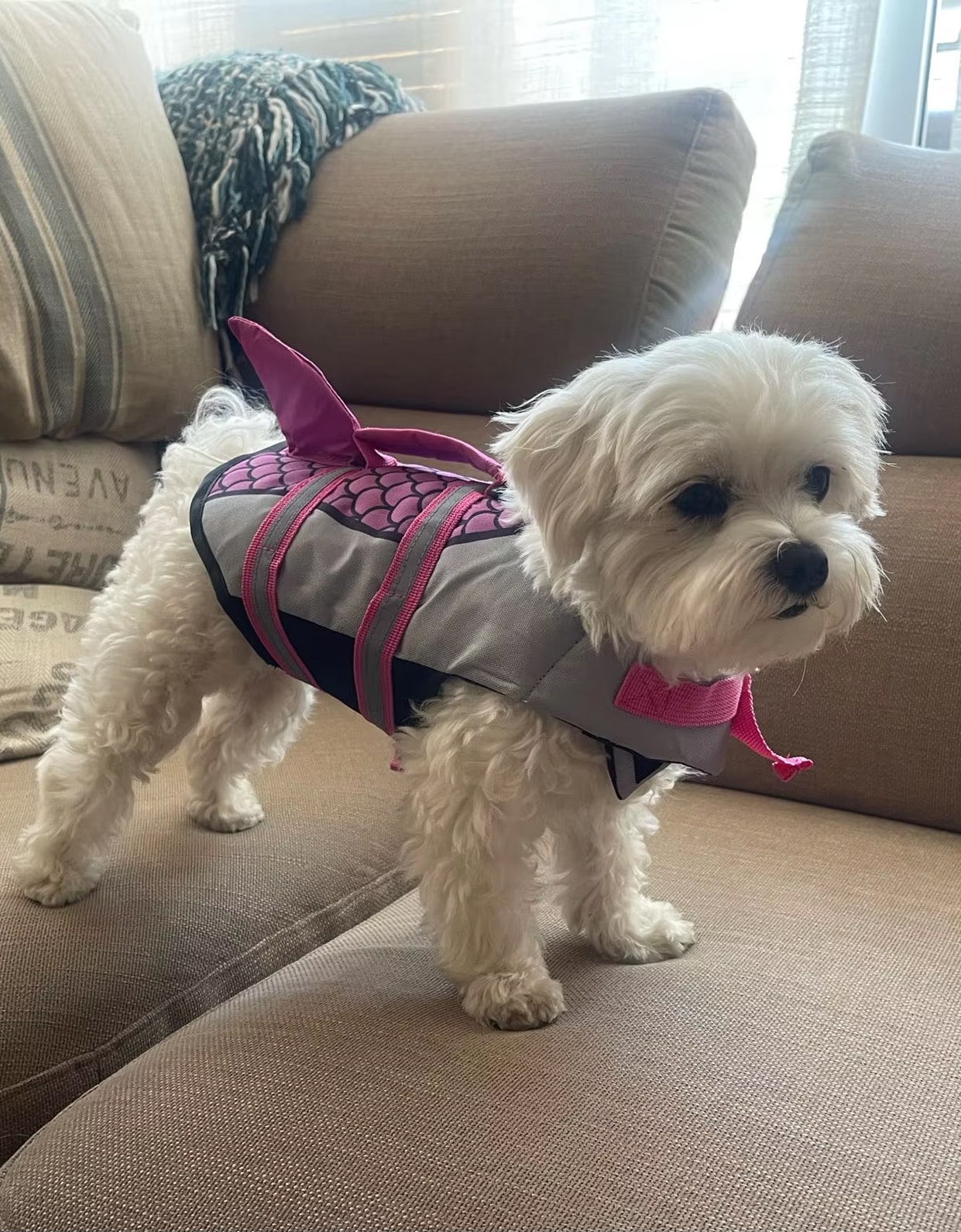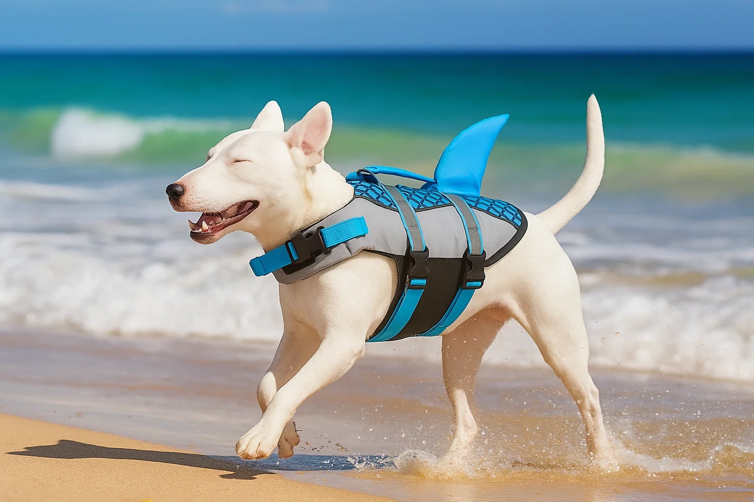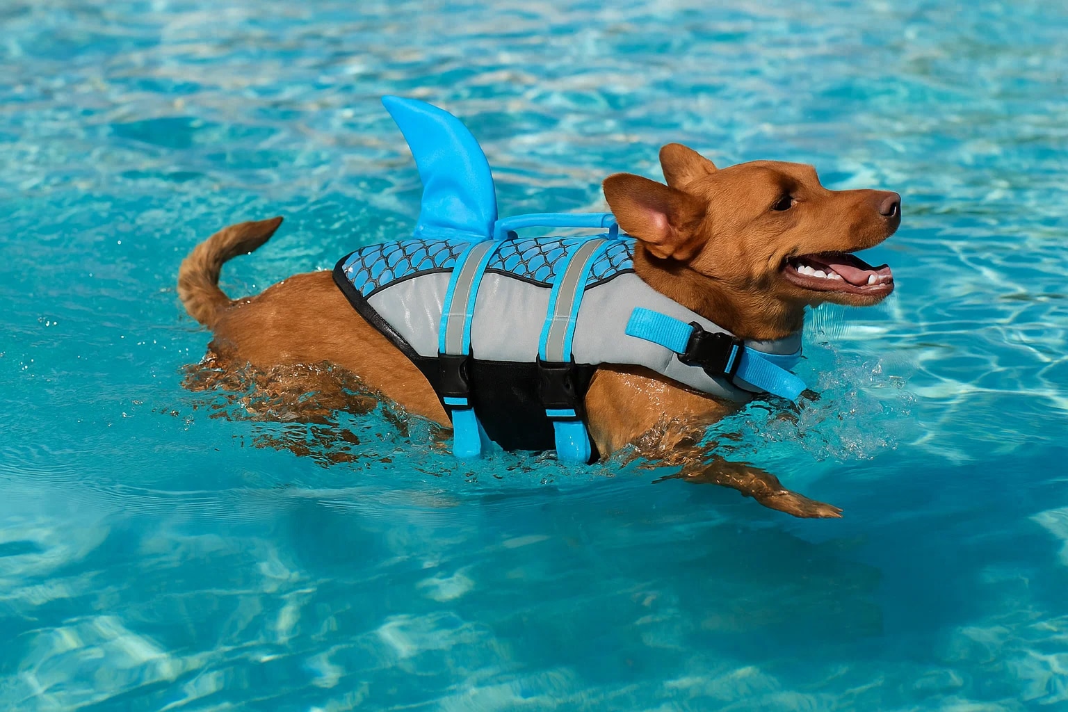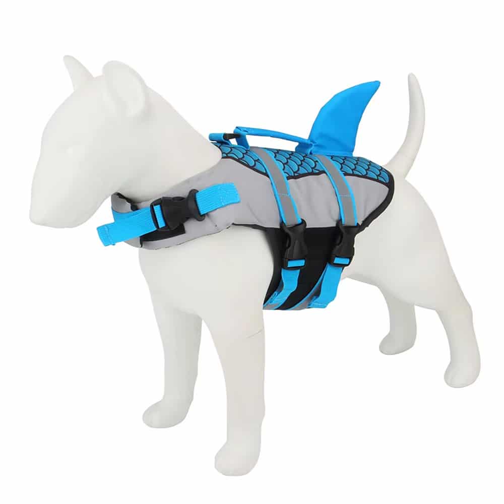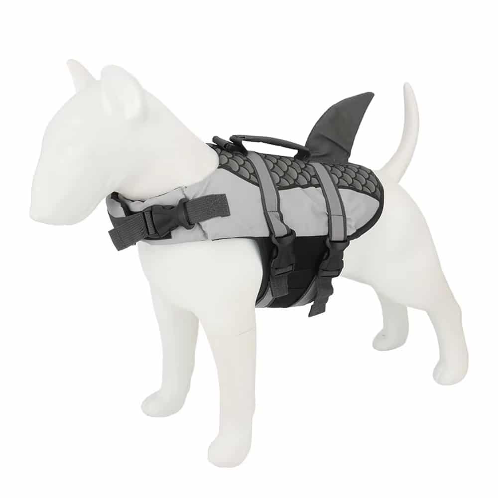 Yes, the shark design is completely safe and securely attached. The decorative elements are made from durable materials that won't detach during swimming. The design also enhances visibility, making it easier to spot your dog in water.