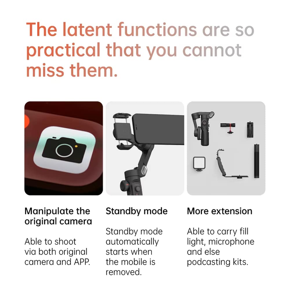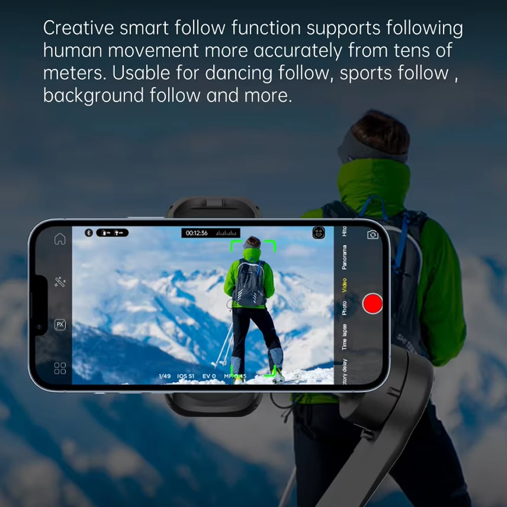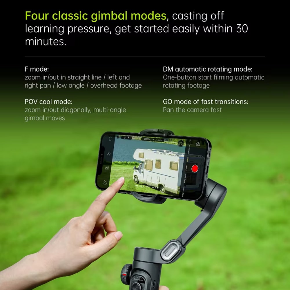 Creative modes are accessed through intuitive physical buttons on the gimbal handle or via the companion smartphone app. Simple button combinations activate different modes instantly, with LED indicators confirming your selection clearly.