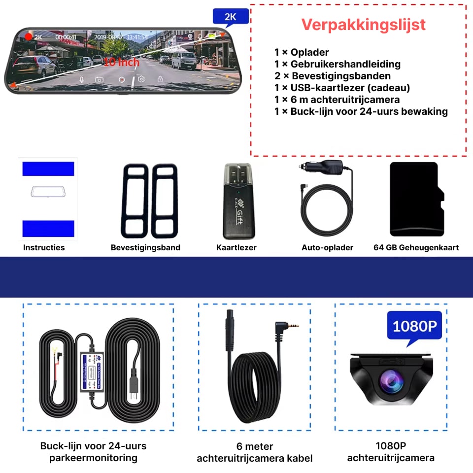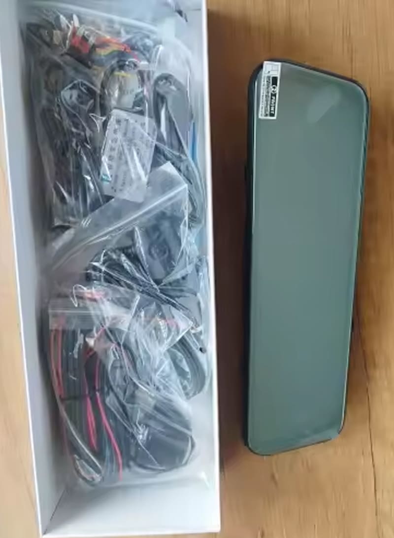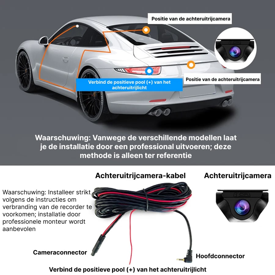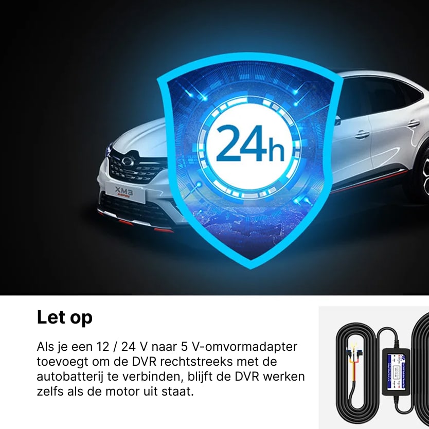 De RiflexCam Spiegel Dashcam wordt geleverd met een optionele hardwire-kit die direct op uw zekeringkast aansluit. Deze kit bevat batterijbescherming die de camera automatisch uitschakelt wanneer de spanning te laag wordt, waardoor acculeegloop wordt voorkomen.