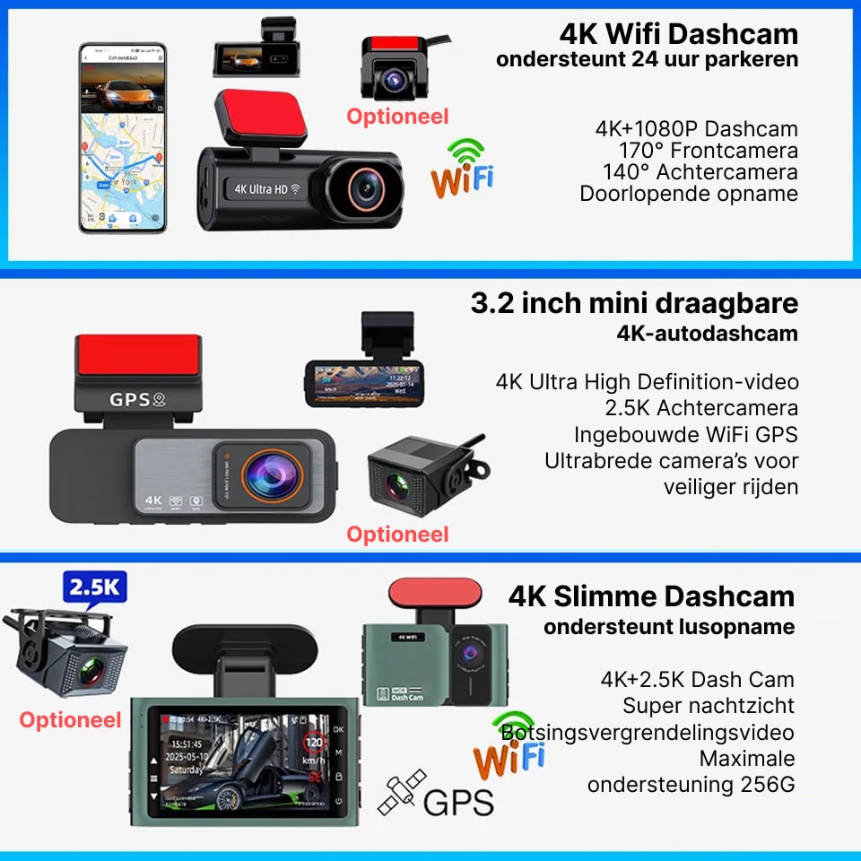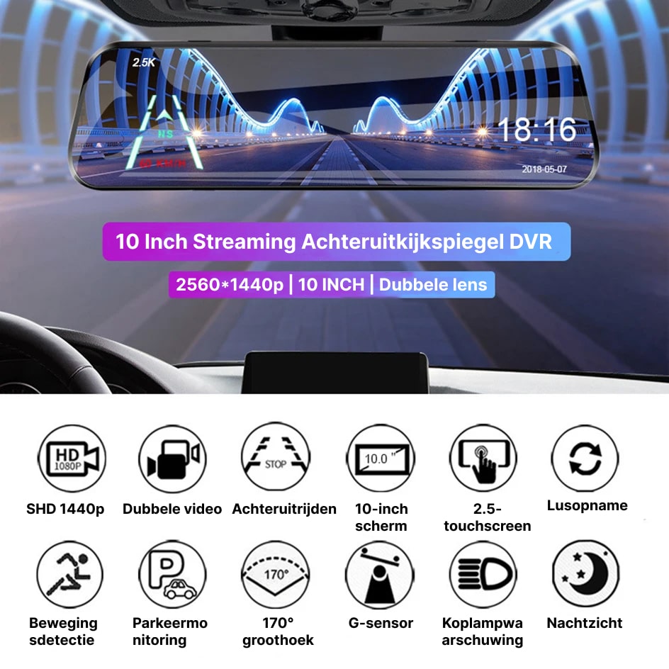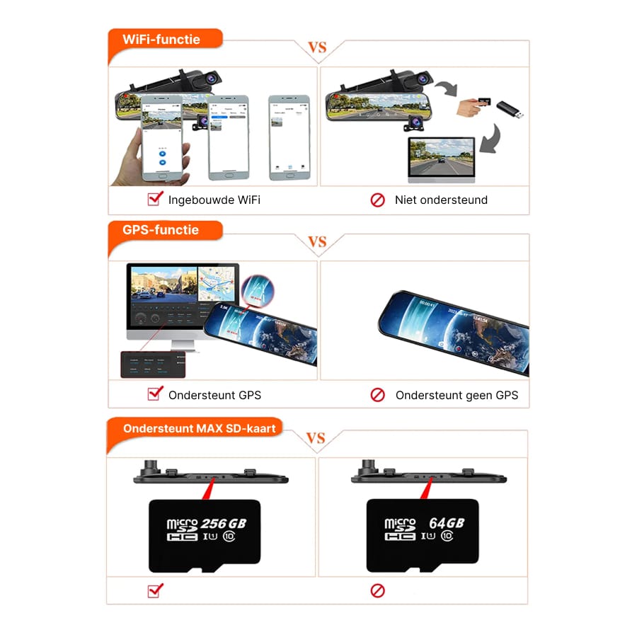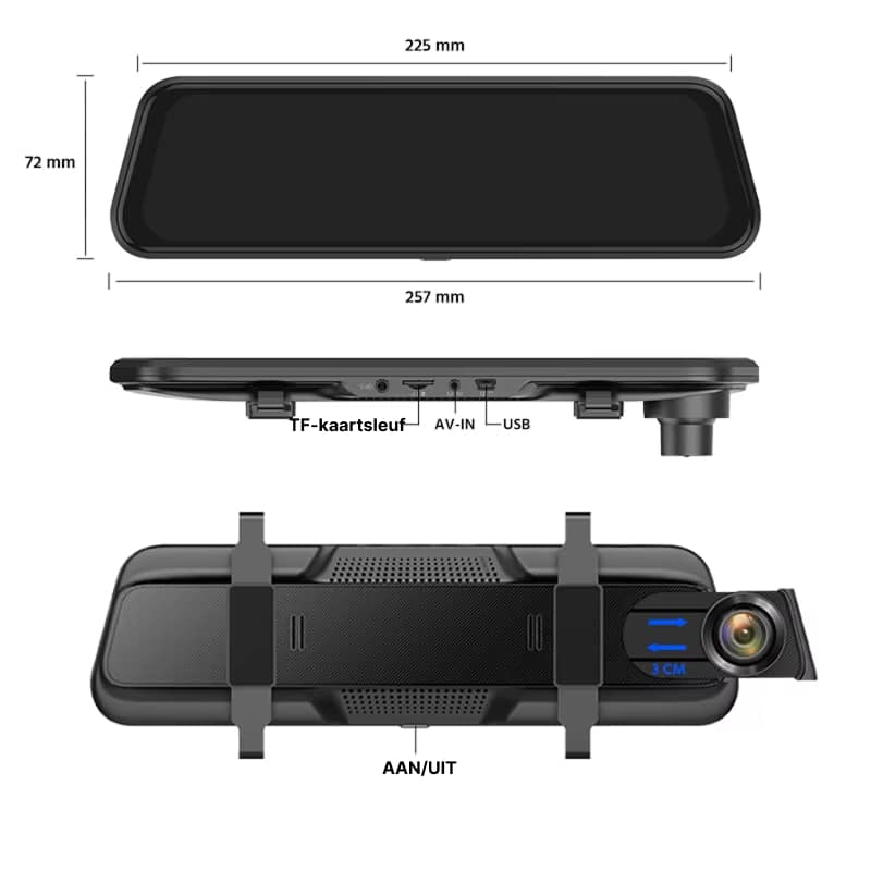 De RiflexCam Spiegel Dashcam ondersteunt geheugenkaarten tot 256GB, wat voldoende ruimte biedt voor urenlange opnames. Loop-opname overschrijft automatisch het oudste beeldmateriaal, zodat u altijd recente beelden heeft zonder handmatige tussenkomst.