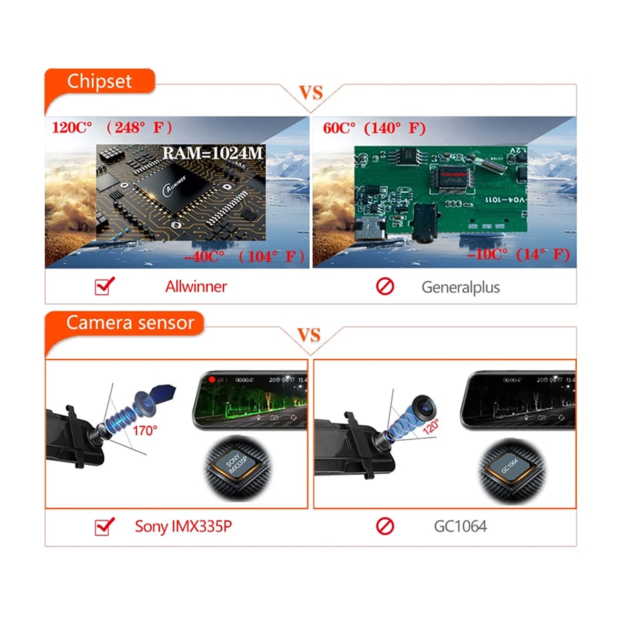The RiflexCam Mirror Dash Cam features premium components including the Allwinner chipset rated for extreme temperatures (-20°C to 70°C) and genuine Sony imaging sensors. This professional-grade hardware ensures reliable performance in harsh conditions where lesser dash cams fail completely.