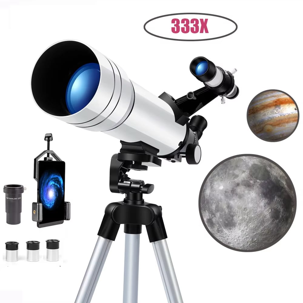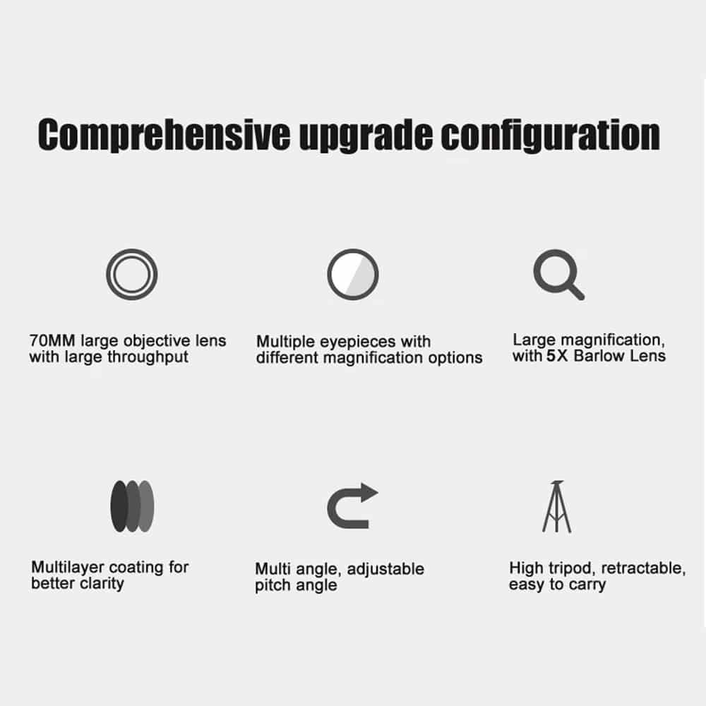 The 70MM objective lens collects 100 times more light than the naked eye, revealing celestial wonders invisible to standard telescopes. Experience breathtaking views of Saturn's rings, Jupiter's moons, and countless deep-sky objects with remarkable clarity and brightness.
