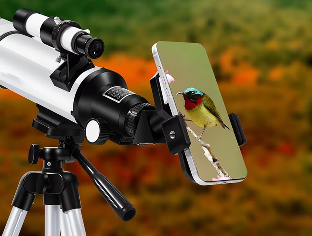 The phone holder features an adjustable spring-loaded clamp that securely accommodates smartphones from 2.4 to 4 inches wide, covering virtually all popular models. Simply align your phone's camera with the eyepiece, tighten the adjustment knob, and you're ready to capture stunning astronomical photos instantly.